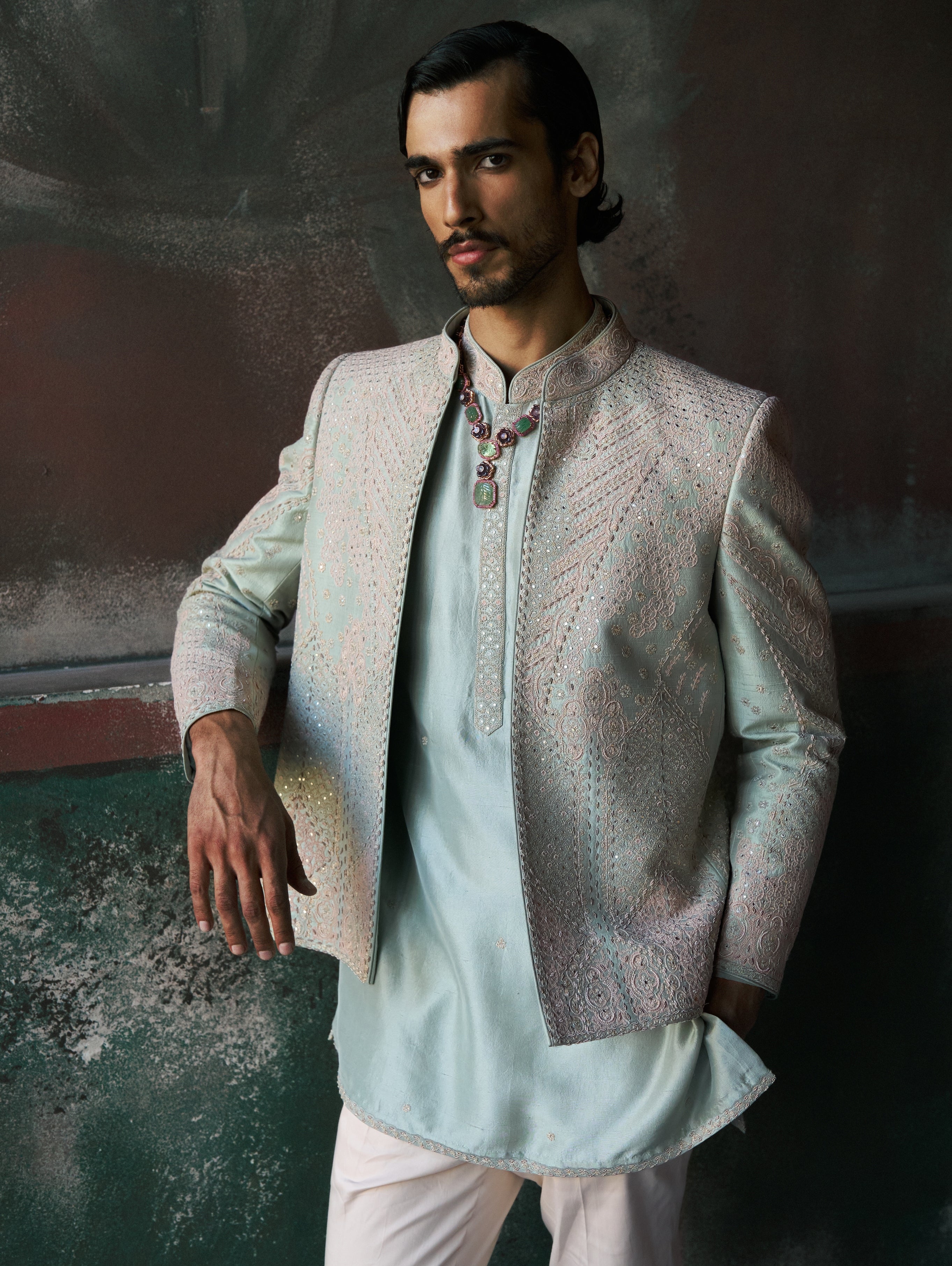 This Nehrav Short Open Jacket, Kurta & Pant Set is a versatile and stylish addition to your wardrobe. Made with high-quality fabric, this set offers a comfortable and flattering fit. The open jacket adds a touch of elegance while the kurta and pant provide a modern and trendy look. Perfect for any occasion, this set is sure to become a staple in your collection.