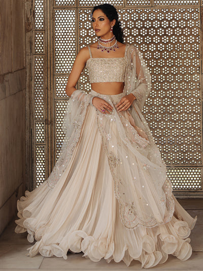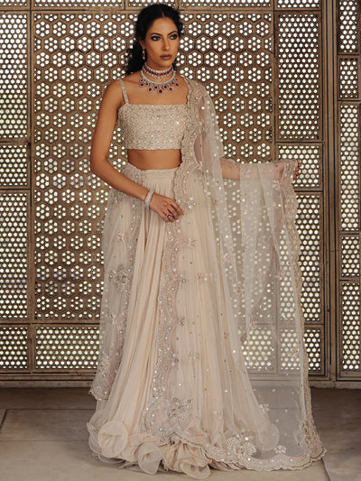 The nude lehenga choli defines ethereal charm with the fine craftsmanship in its uniquely crafted blouse. It comes with a net dupatta featuring resham and zardozi and signature swirly lehenga making it a perfect choice for day or evening soirees.