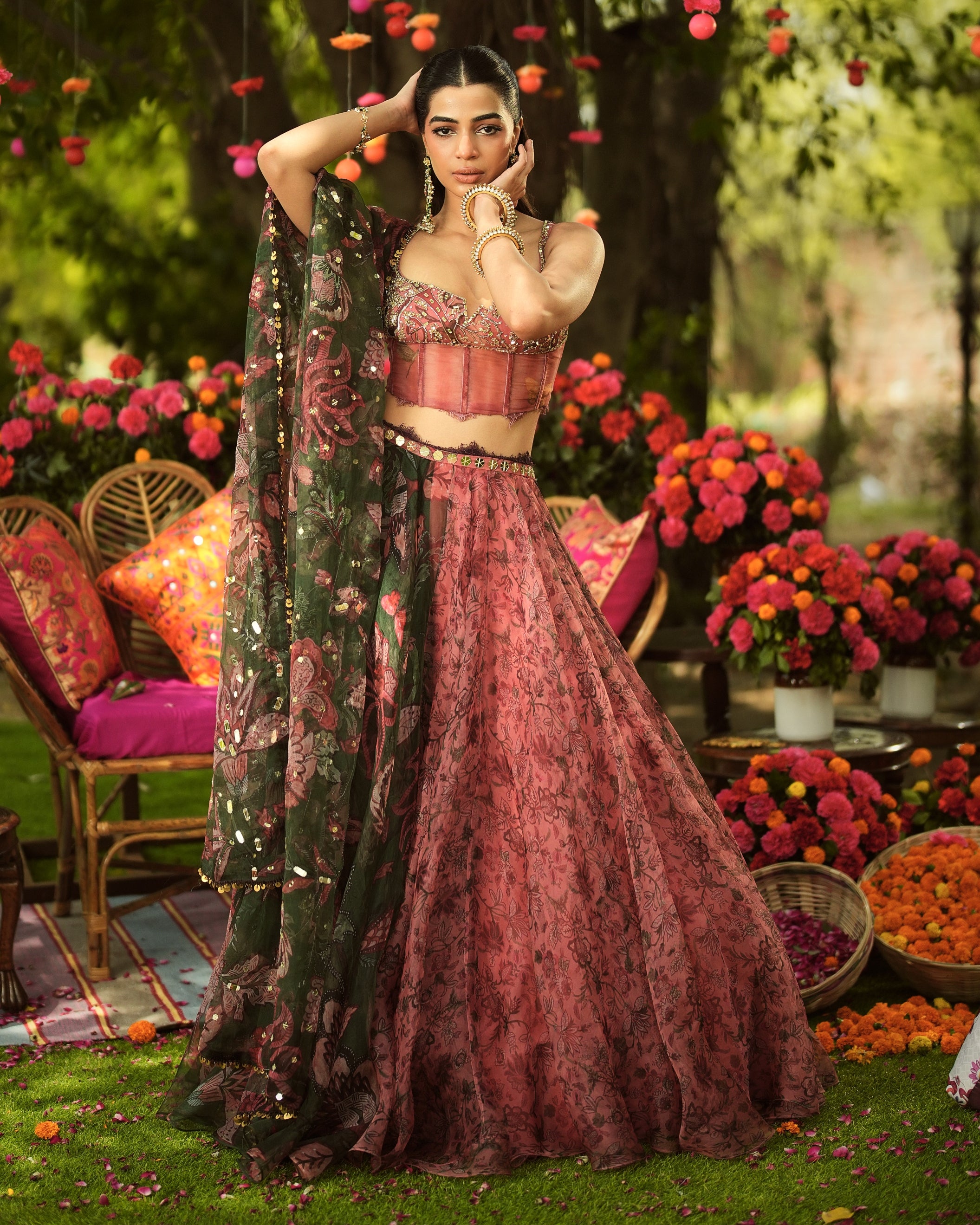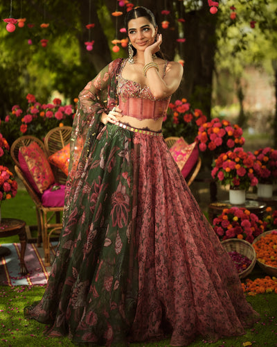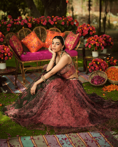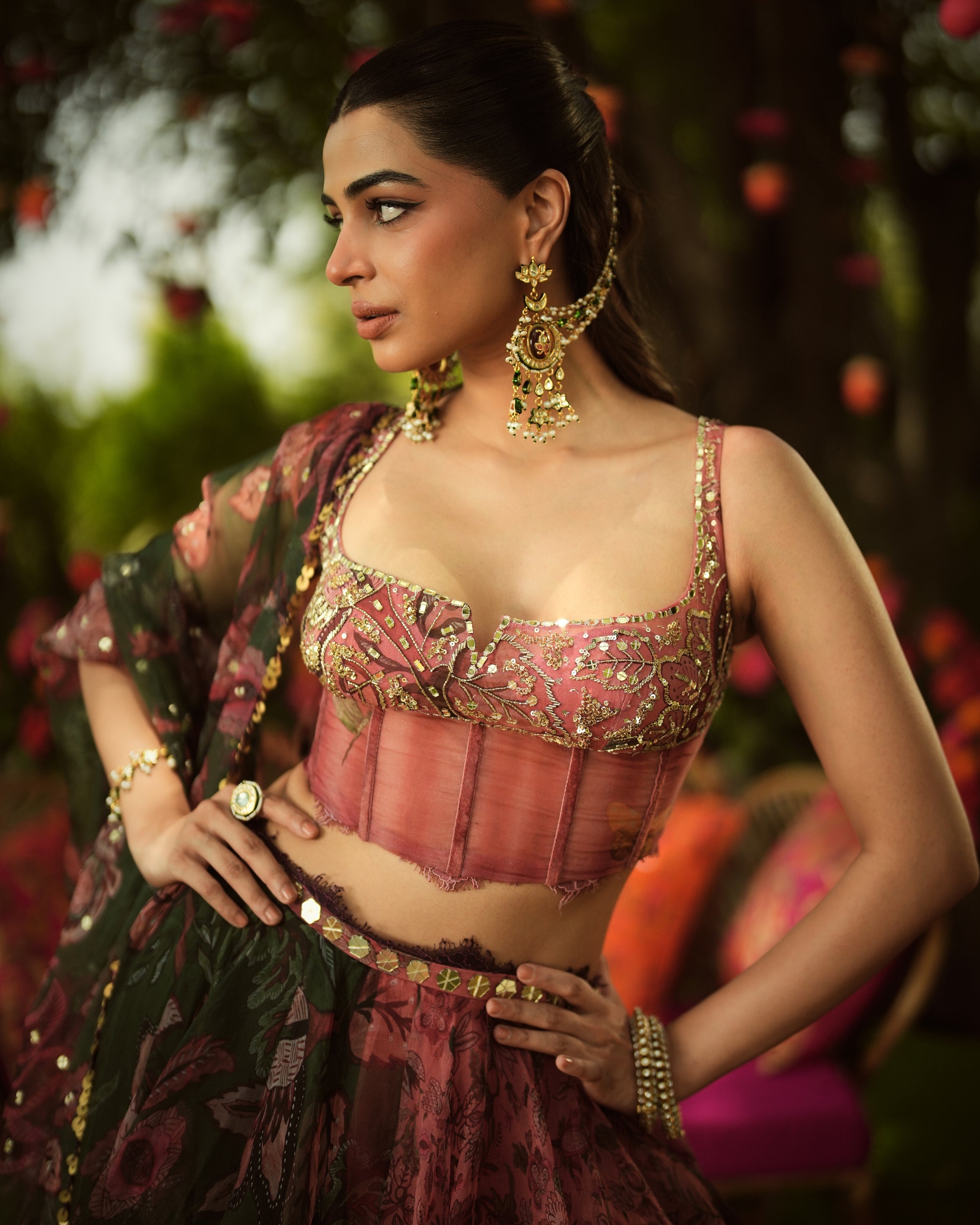 Exquisitely crafted, the Palak lehenga set features a meticulously hand-embroidered corset top paired with an elegant dupatta. The ensemble is completed with a lehenga adorned with refined lace detailing, creating a harmonious balance of traditional artisanship and contemporary sophistication. Each element has been thoughtfully designed to ensure a graceful silhouette for discerning occasions.
