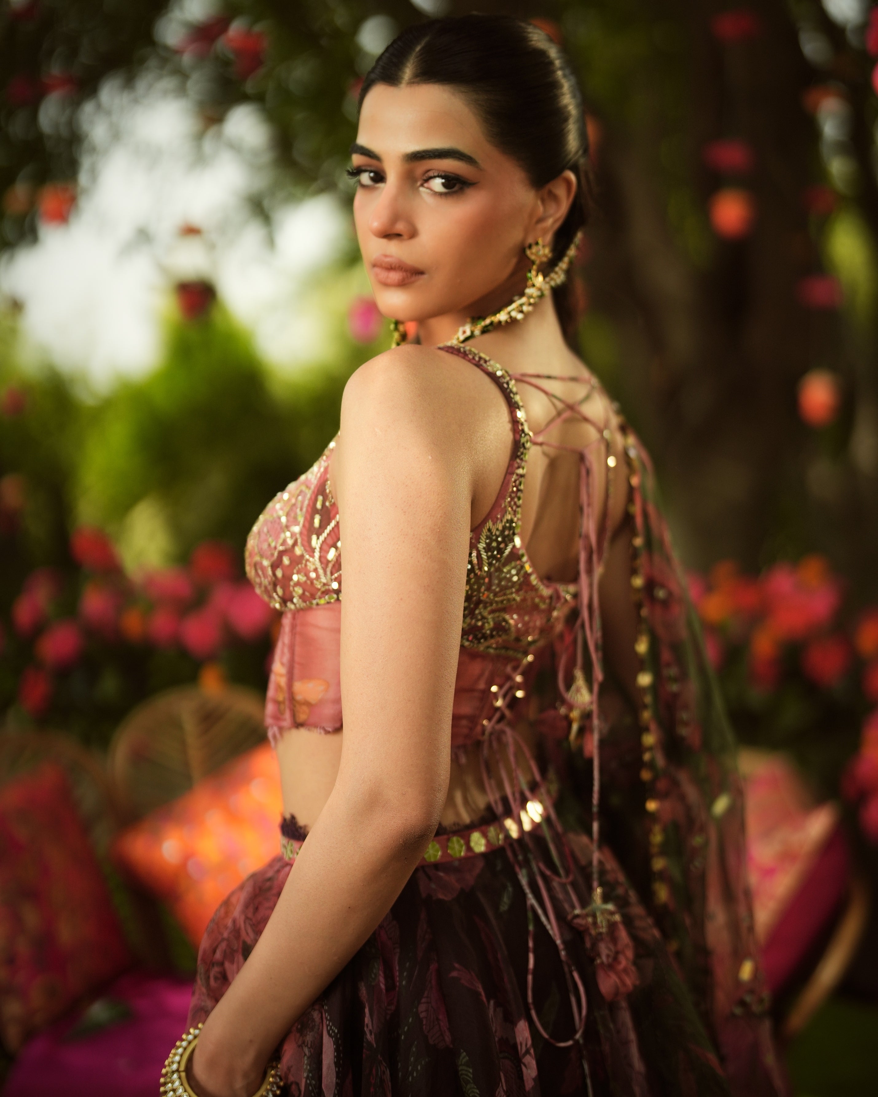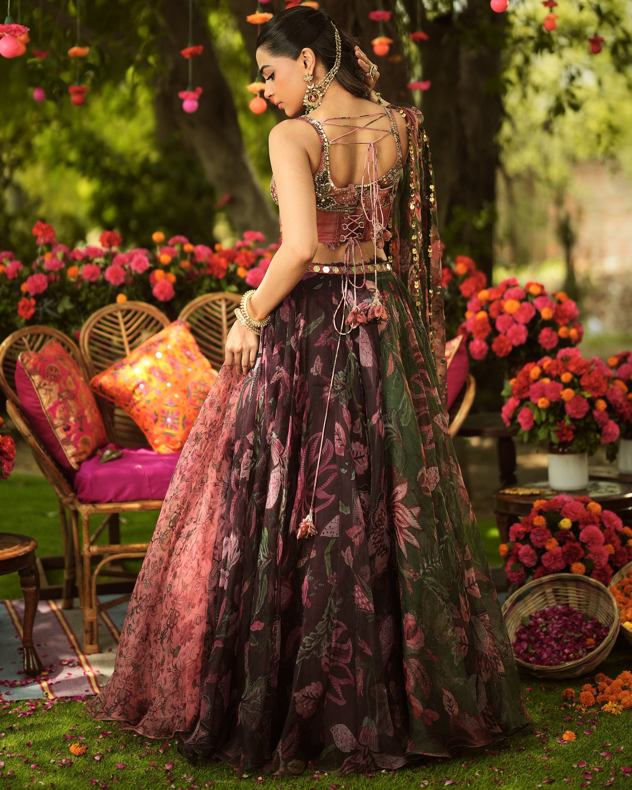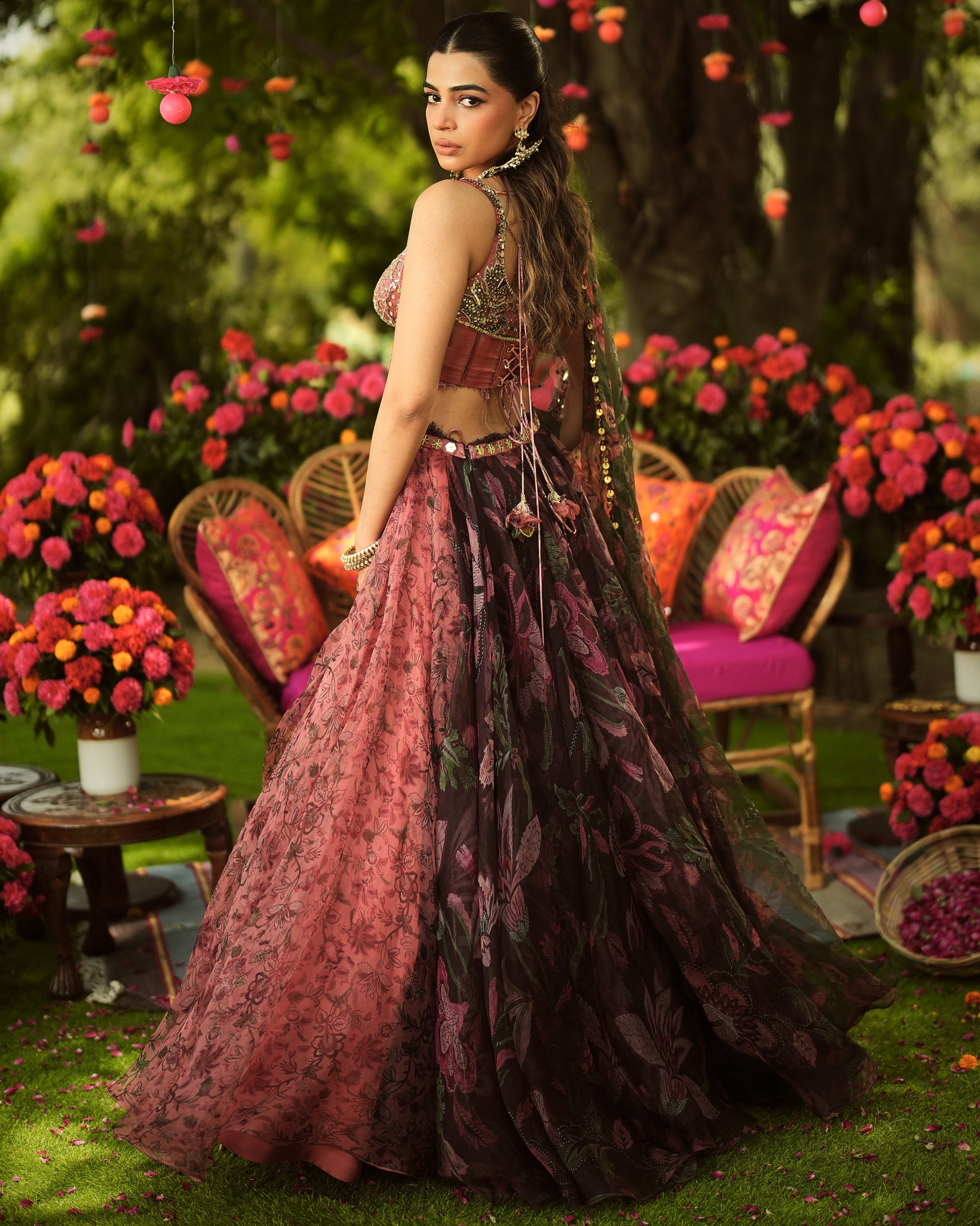 Exquisitely crafted, the Palak lehenga set features a meticulously hand-embroidered corset top paired with an elegant dupatta. The ensemble is completed with a lehenga adorned with refined lace detailing, creating a harmonious balance of traditional artisanship and contemporary sophistication. Each element has been thoughtfully designed to ensure a graceful silhouette for discerning occasions.
