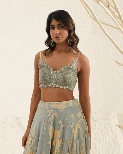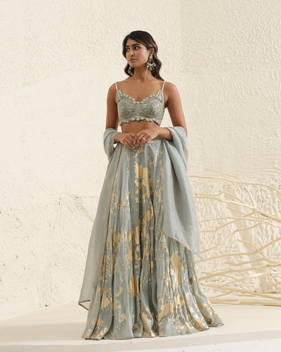 The KYNAH Periwinkle Lehenga features gold foil work, an embellished blouse, and an organza dupatta, creating an enchanting ensemble.