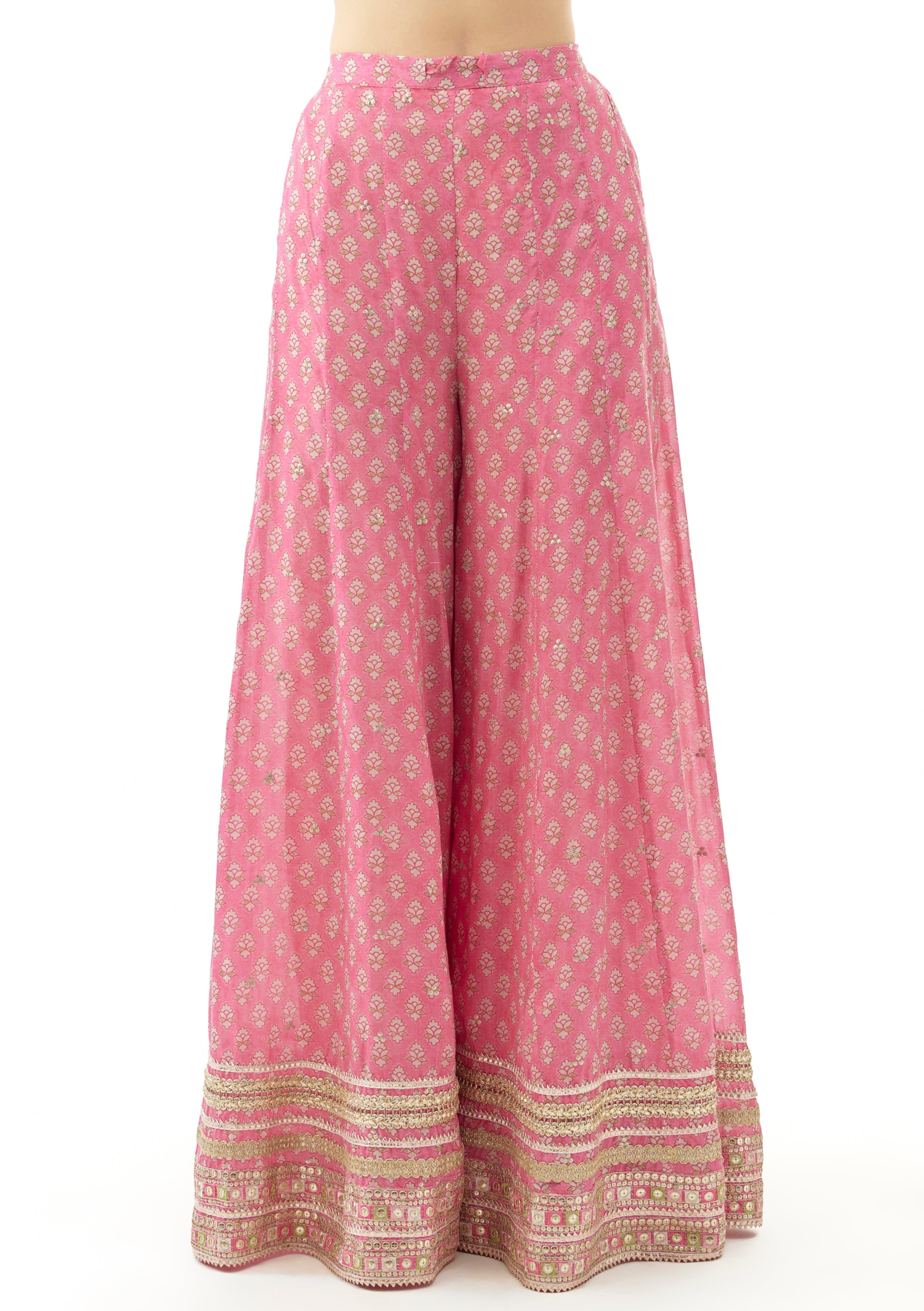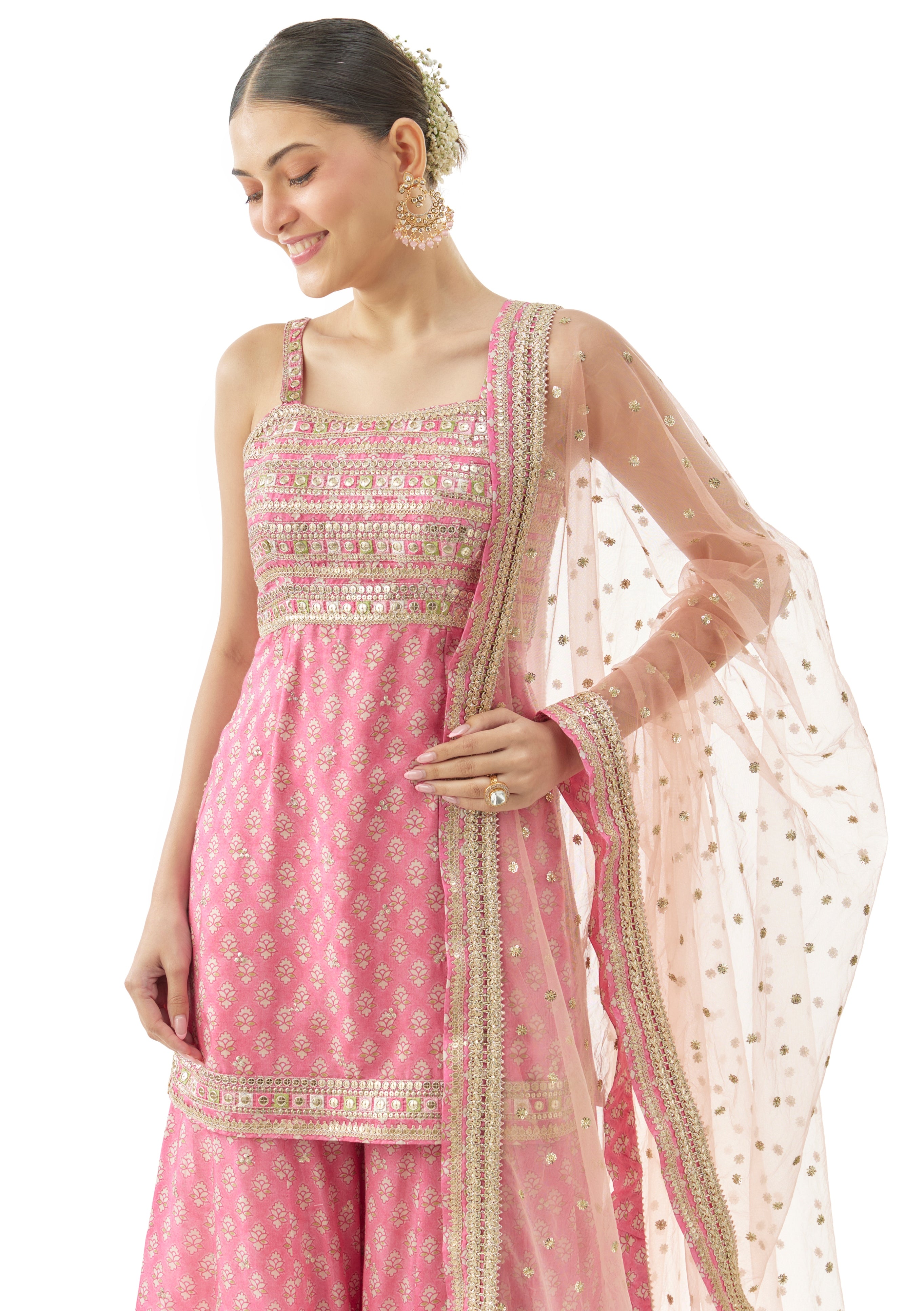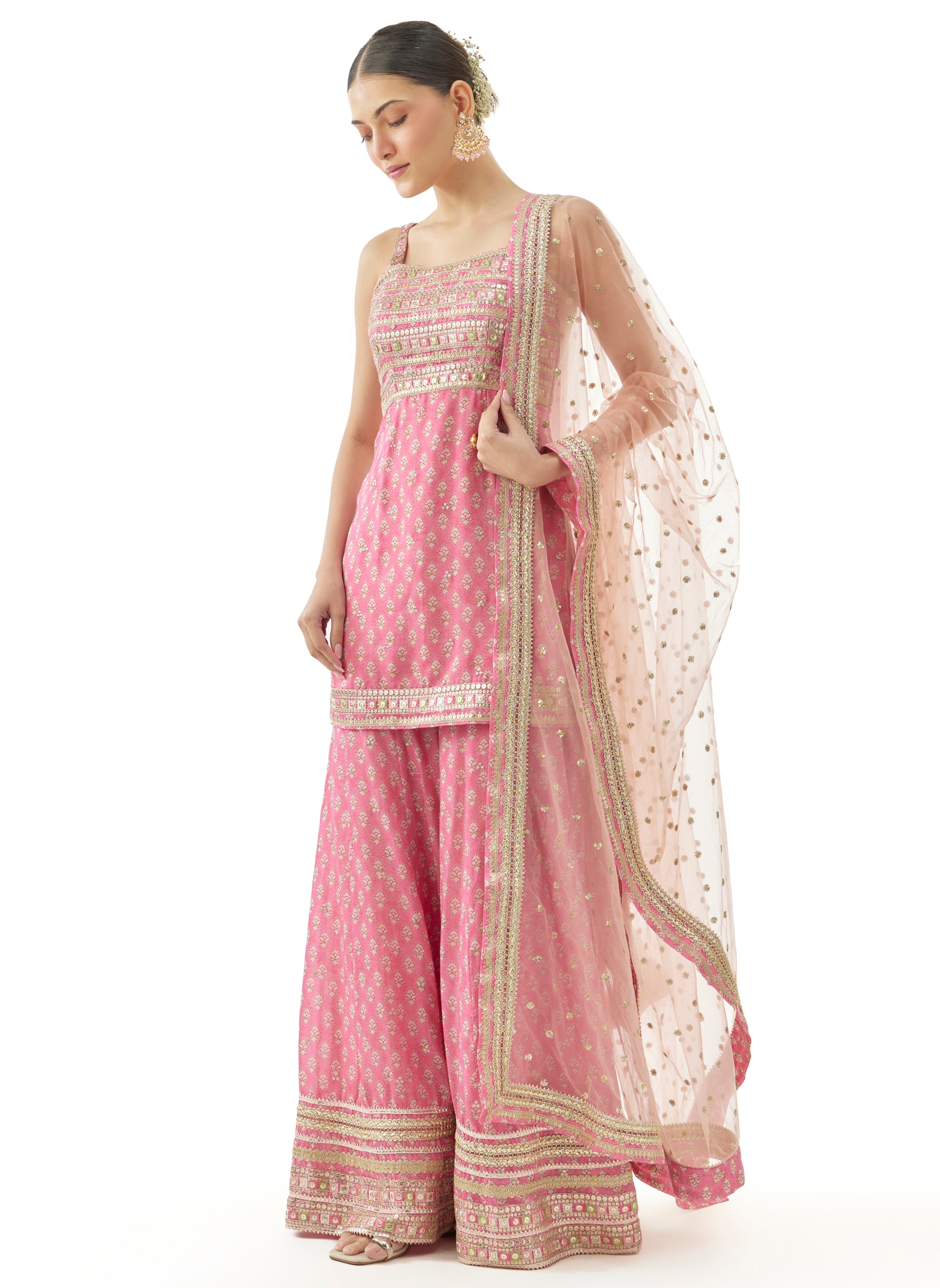 This Pink nitya strappy sharara set exudes elegance with its sleeveless kurti, featuring intricate embroidery that adds a regal charm. The matching sharara pants flare gracefully, highlighted by complementary embroidered hems for a harmonious silhouette. Completing the ensemble is a delicate dupatta adorned with subtle motifs and a detailed border, perfect for sophisticated occasions.