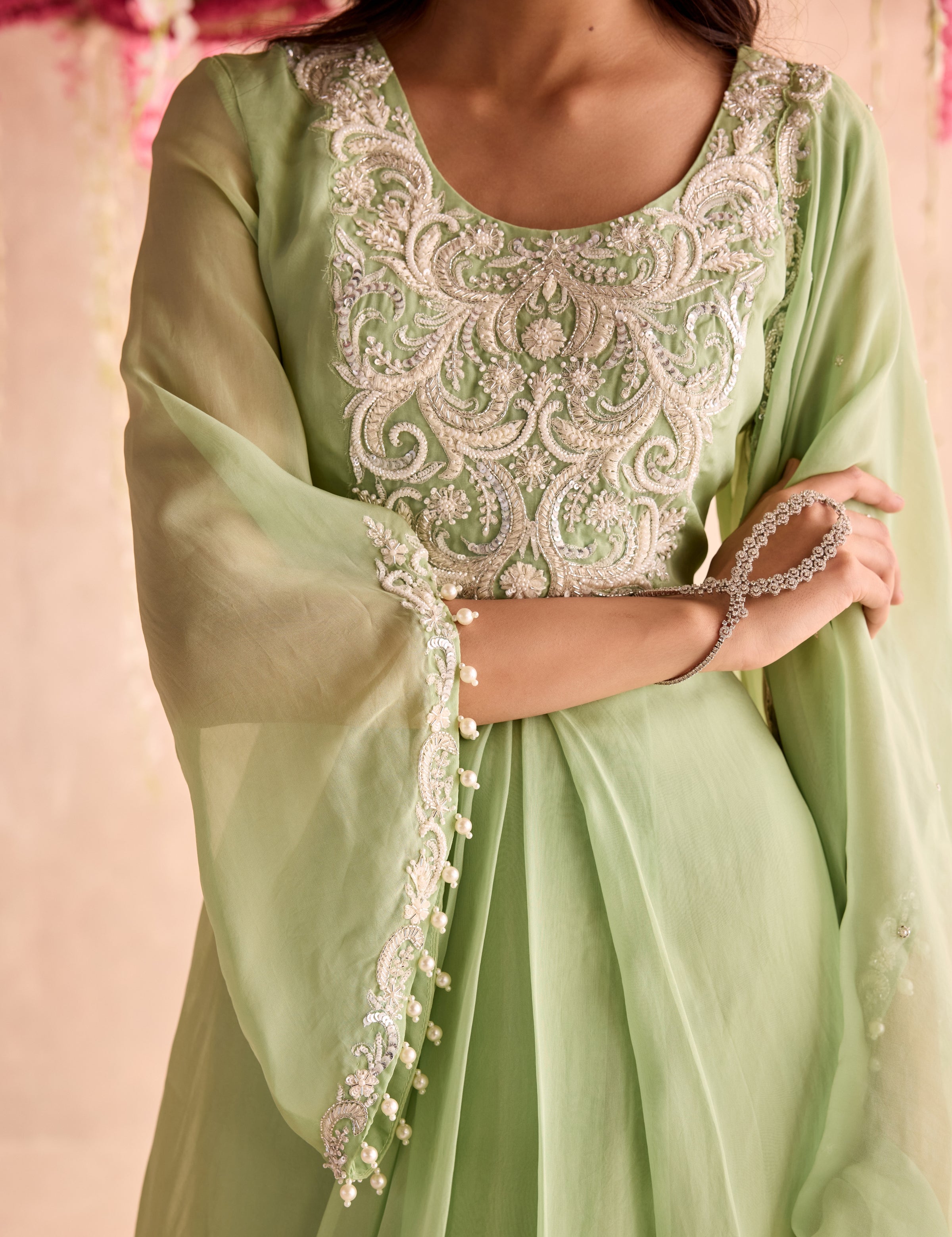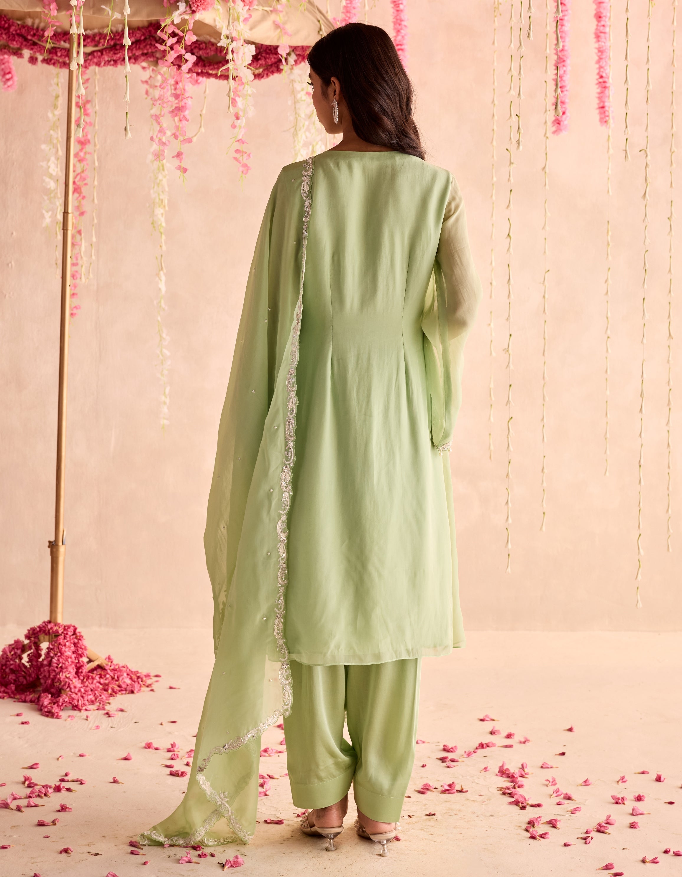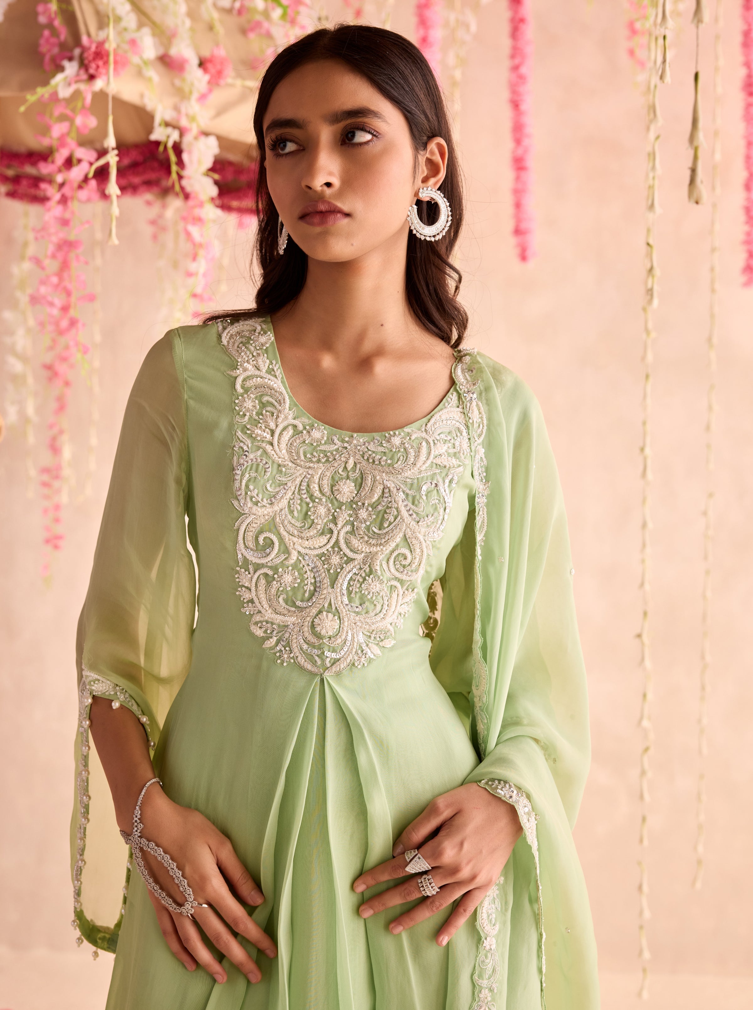 Upgrade your ethnic wardrobe with our Poppy straight suit set. This stunning set features a pleated kurta with petal sleeves, embellished to perfection. Paired with a luxurious satin salwar and an organza dupatta, this set exudes elegance and style. Perfect for any special occasion or formal event.
