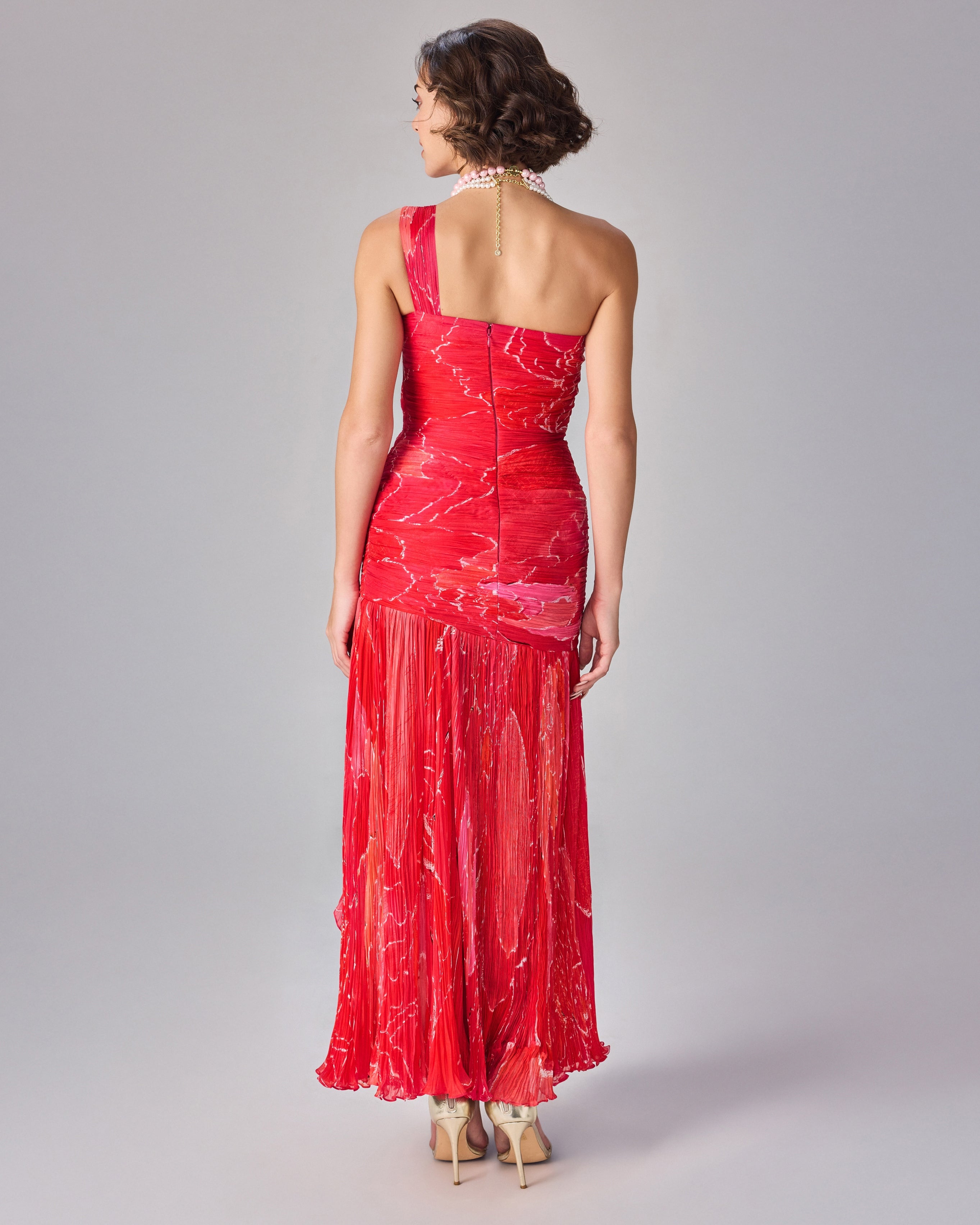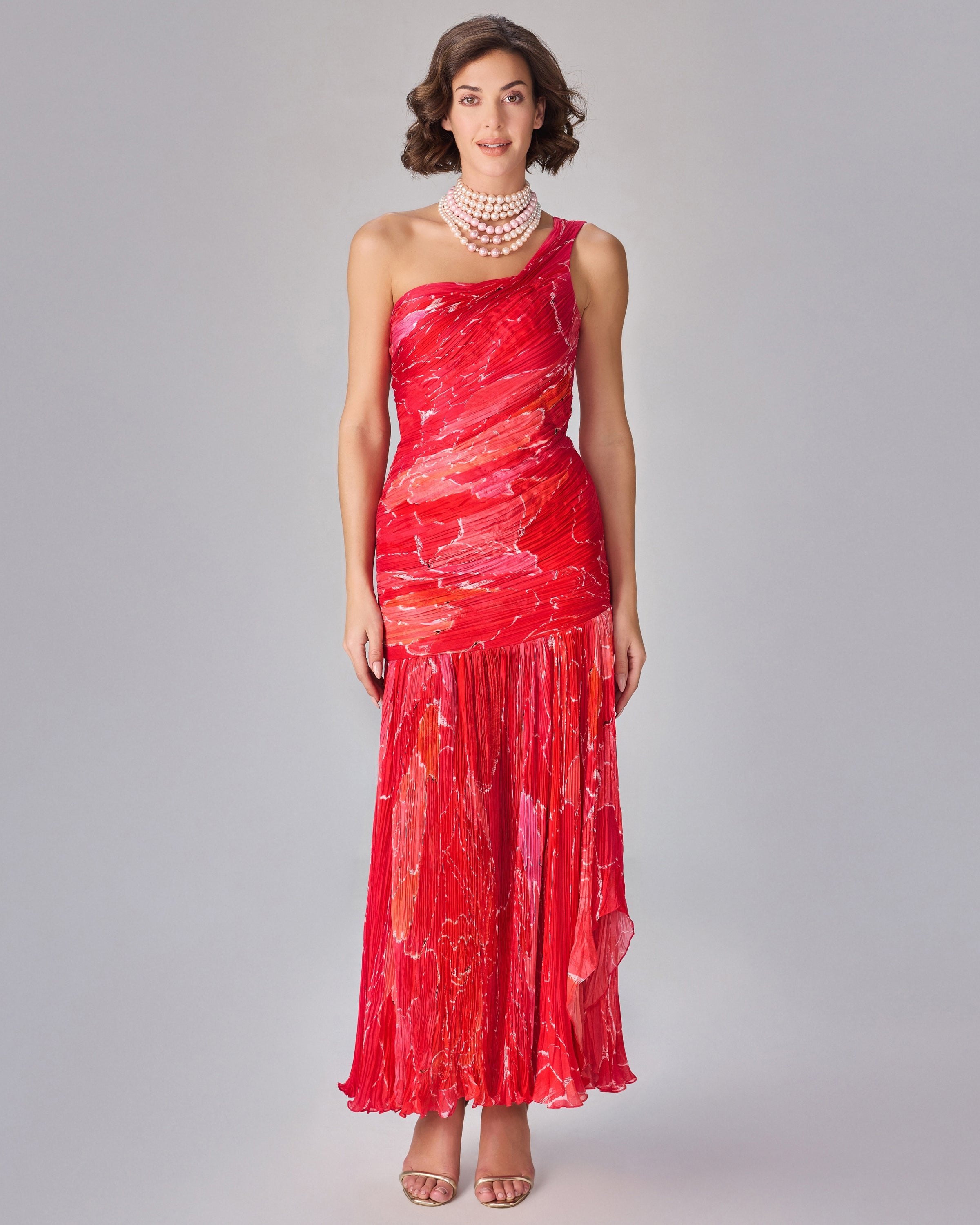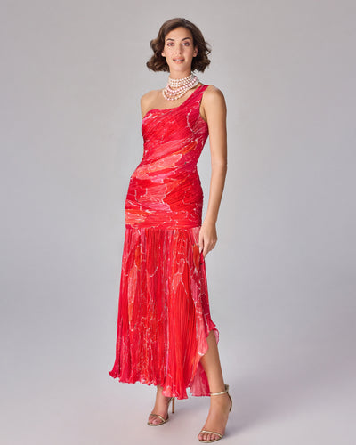 Expertly crafted with a unique abstract floral print, the Raya dress is the perfect balance of elegance and boldness. The hand micro pleat one shoulder design accentuates the fitted bodice, while the asymmetric side slit adds a touch of edginess. Make a statement at your next event with this stunning dress.