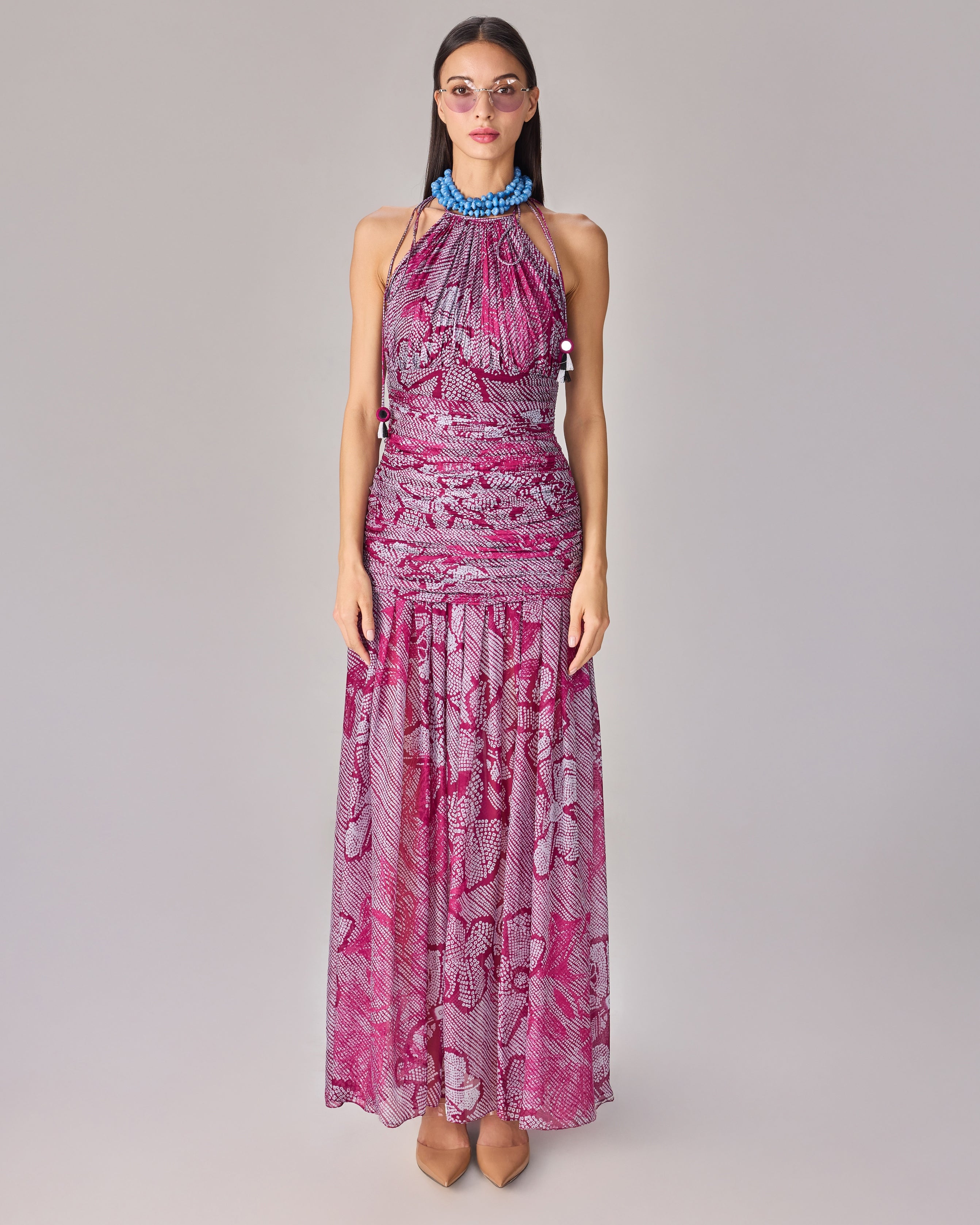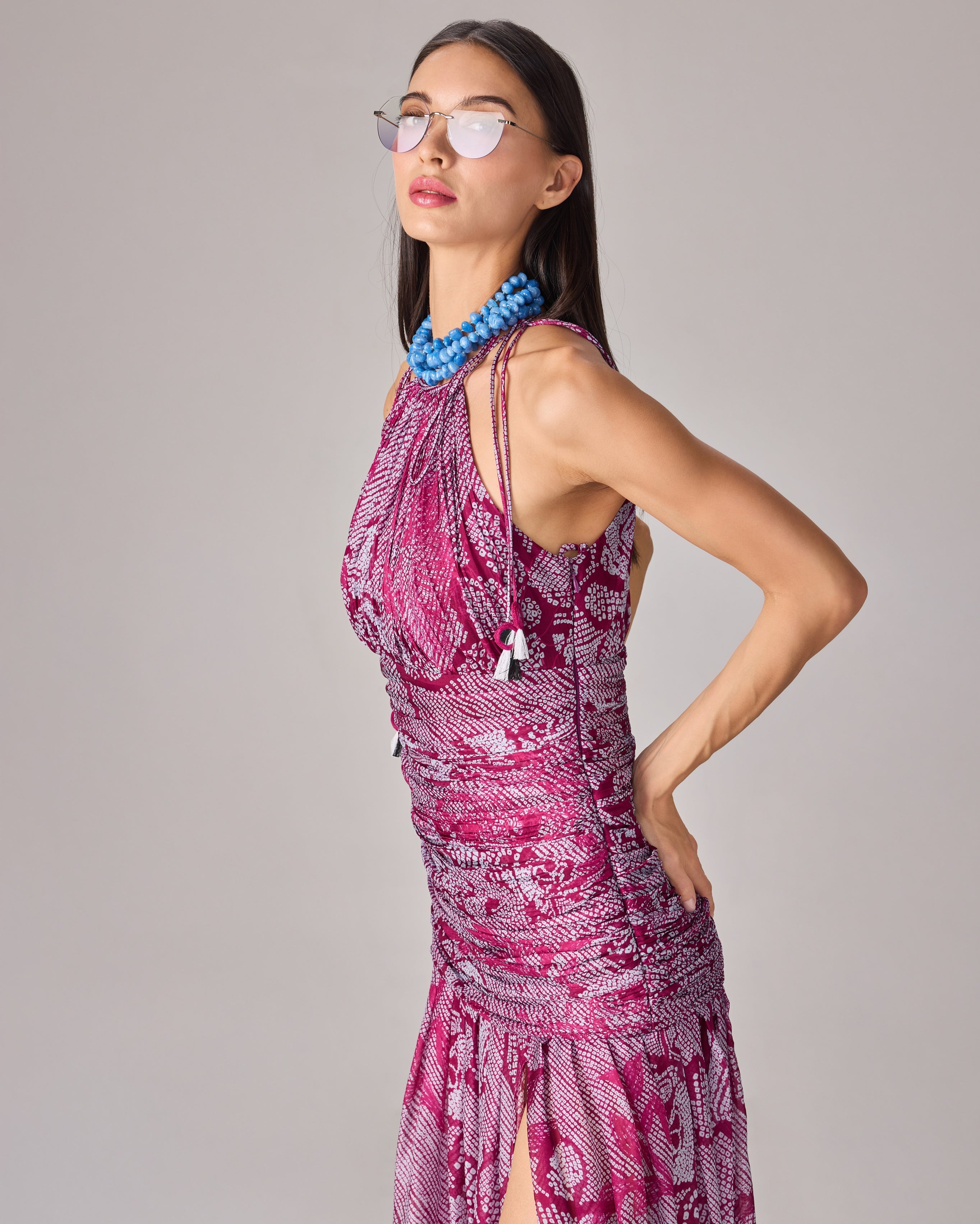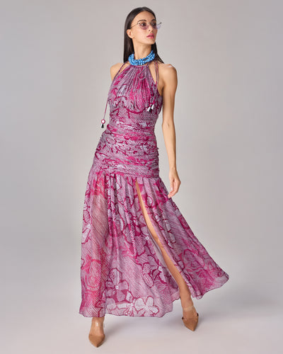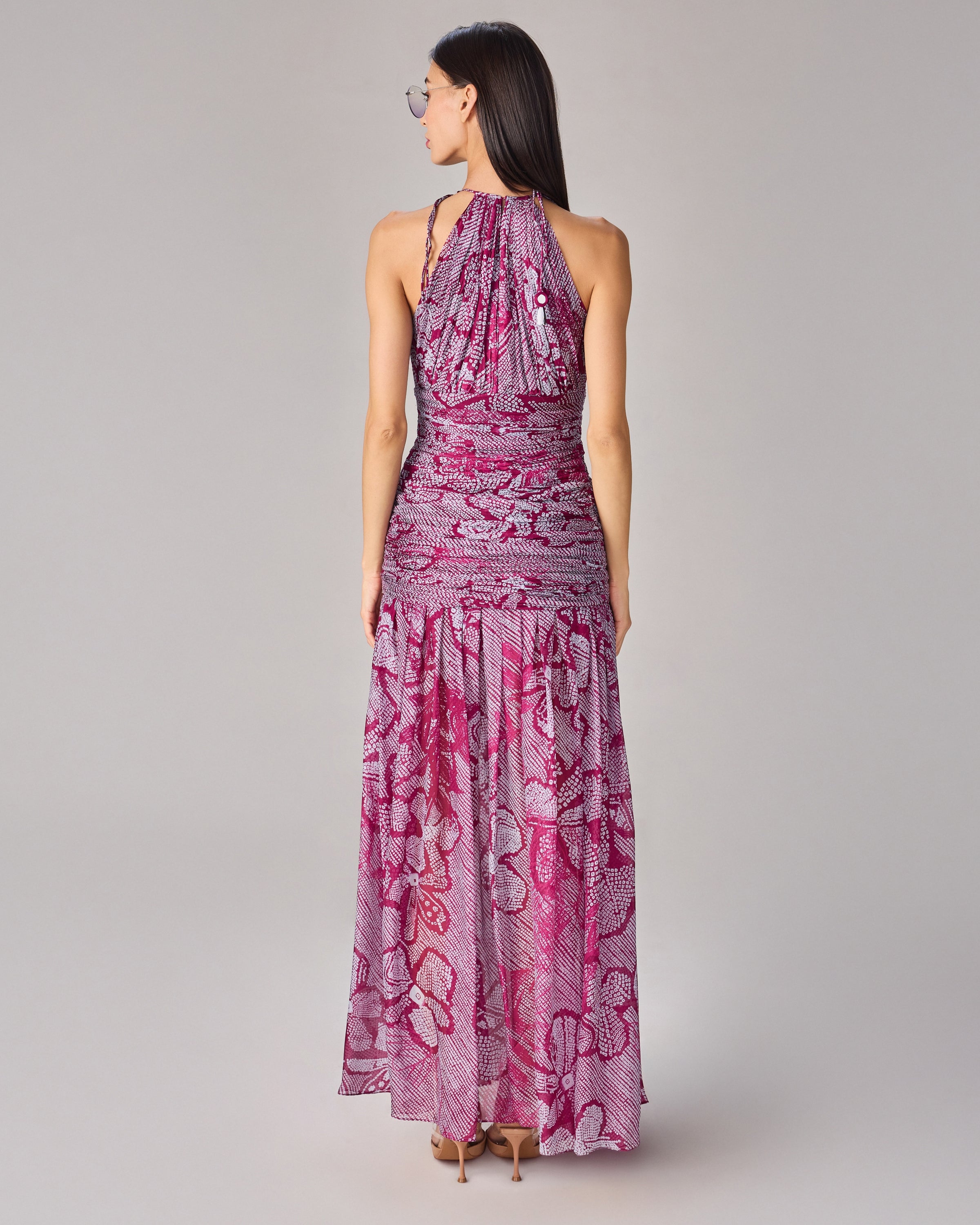 The Sapphire dress boasts a stunning combination of bandhani and floral prints, highlighting the elegance of the halter neck maxi design. The hand micro pleat bodice and waist add intricate detail, while the customisable side slit and hand-embroidered mirrored tassel tie-ups allow for a personalized fit. Elevate your style with this unique and expertly crafted dress.