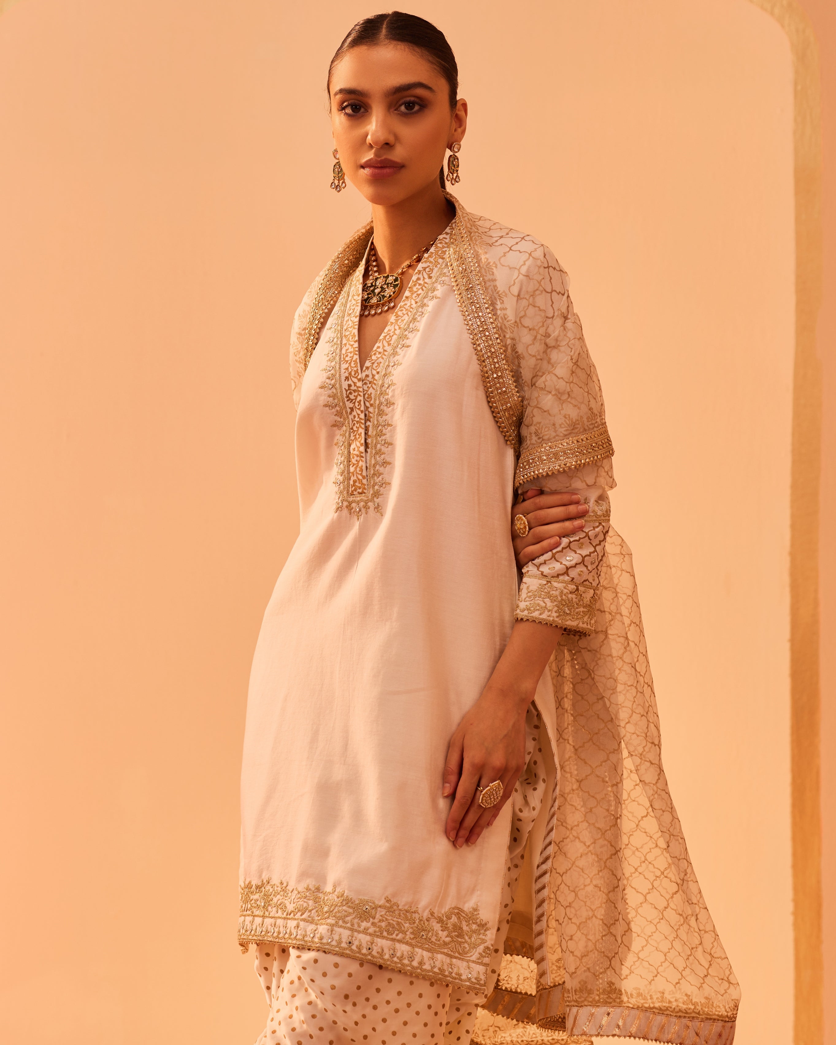 This ensemble is made in pure silk chanderi, a bamberg satin dhoti and is teamed up with a silk organza dupatta. The kurta has a zero neck with a placket and three-quarter sleeves. The outfit is adorned with a signature block print highlighted with tilla and patra embroidery. It is finished with a pure banarsi fabric and gota detailing.