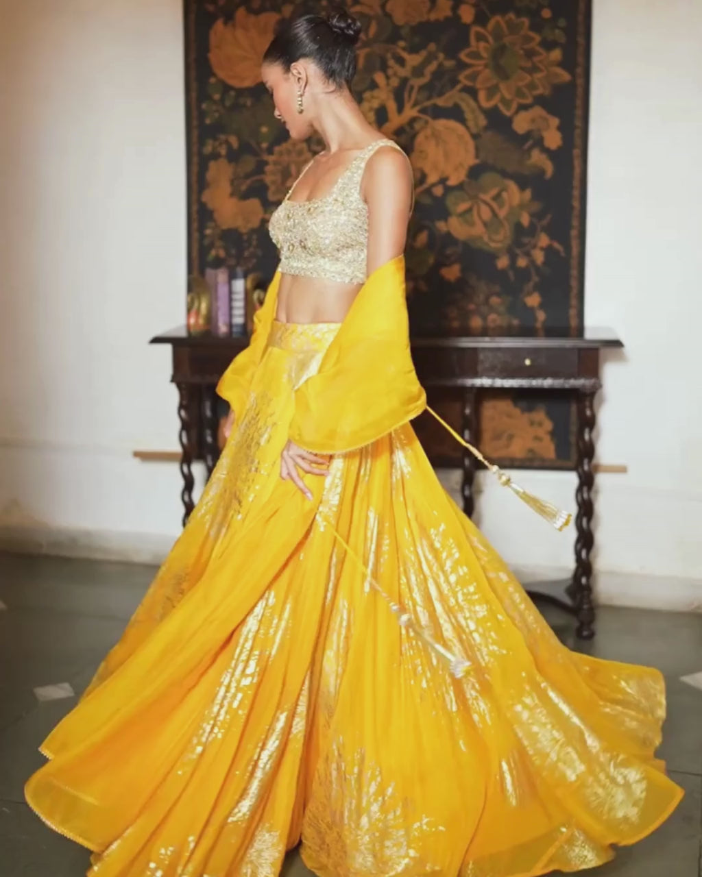 The Savera Lehenga by KYNAH is a vibrant showstopper in a rich mustard hue, crafted with our signature gold foil print. The square-neckline blouse is heavily embellished with moti, cutdana, and sequin embroidery, creating a dazzling statement look. Paired with a coordinating lehenga featuring bold foil motifs and a matching dupatta, this ensemble blends modern sophistication with timeless KYNAH craftsmanship — perfect for festive occasions, weddings, or evening celebrations.