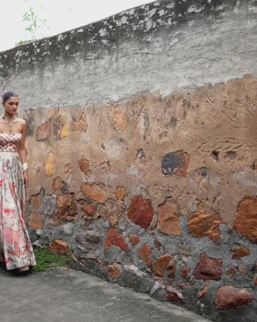 An exclusive collaboration between KYNAH and Drishti & Zahabia, the Shayona Lehenga features a strapless corset blouse with a sweetheart neckline and tie-up back, paired with a flowing ivory dupion silk lehenga adorned with red floral and motif prints. The skirt is finished with an intricately embroidered waistband, while a coordinating net dupatta completes the ensemble.