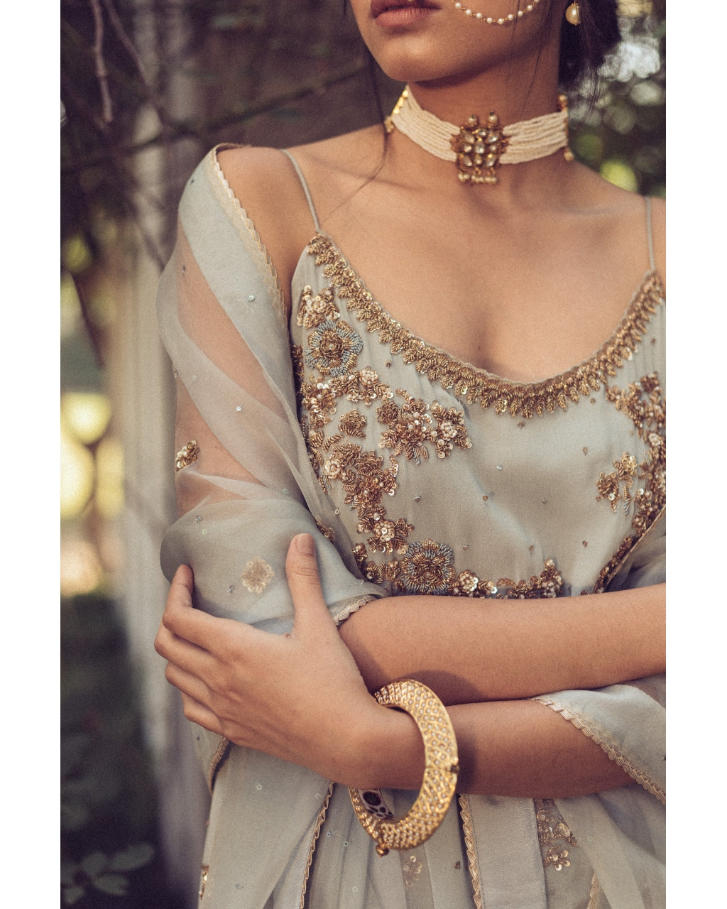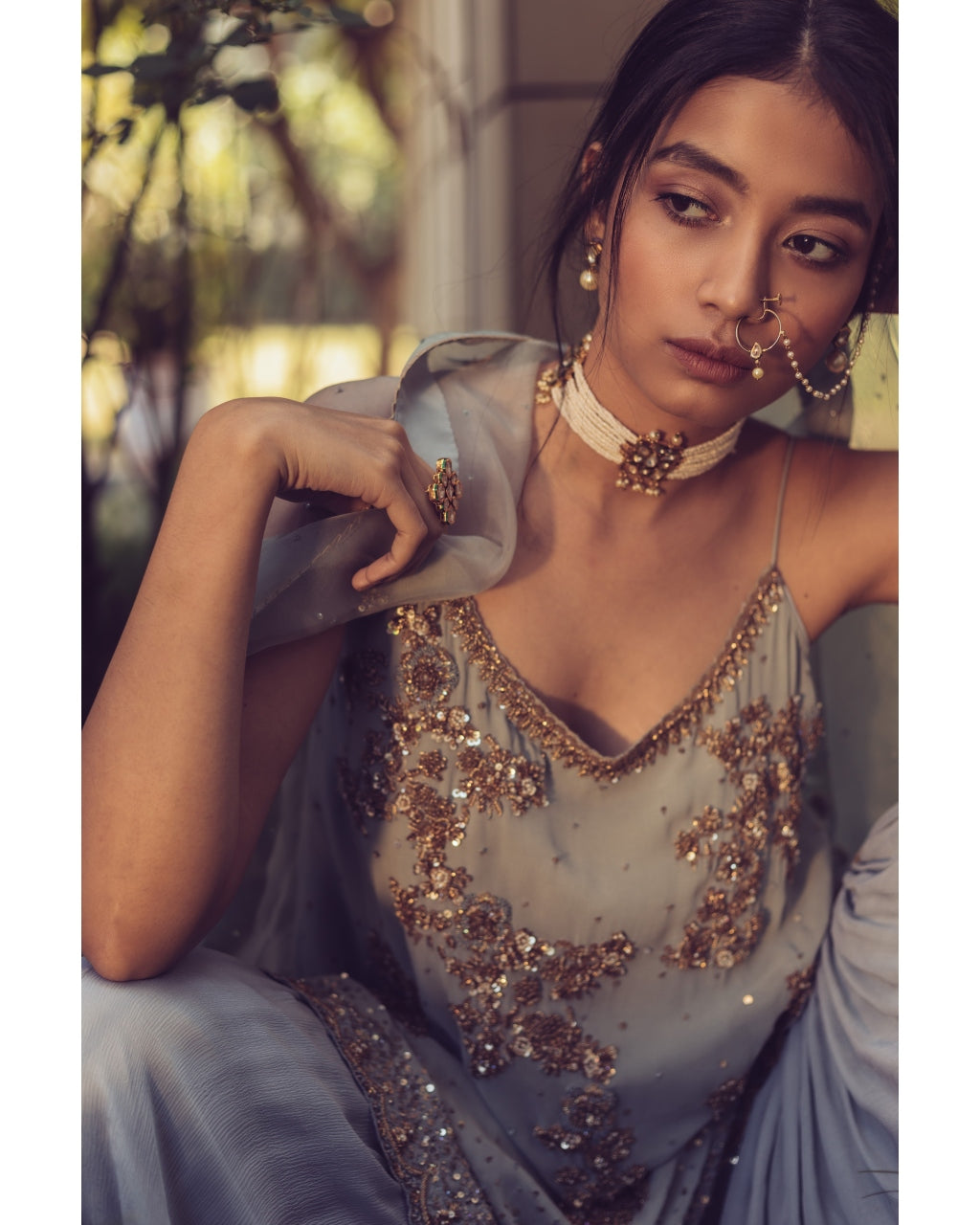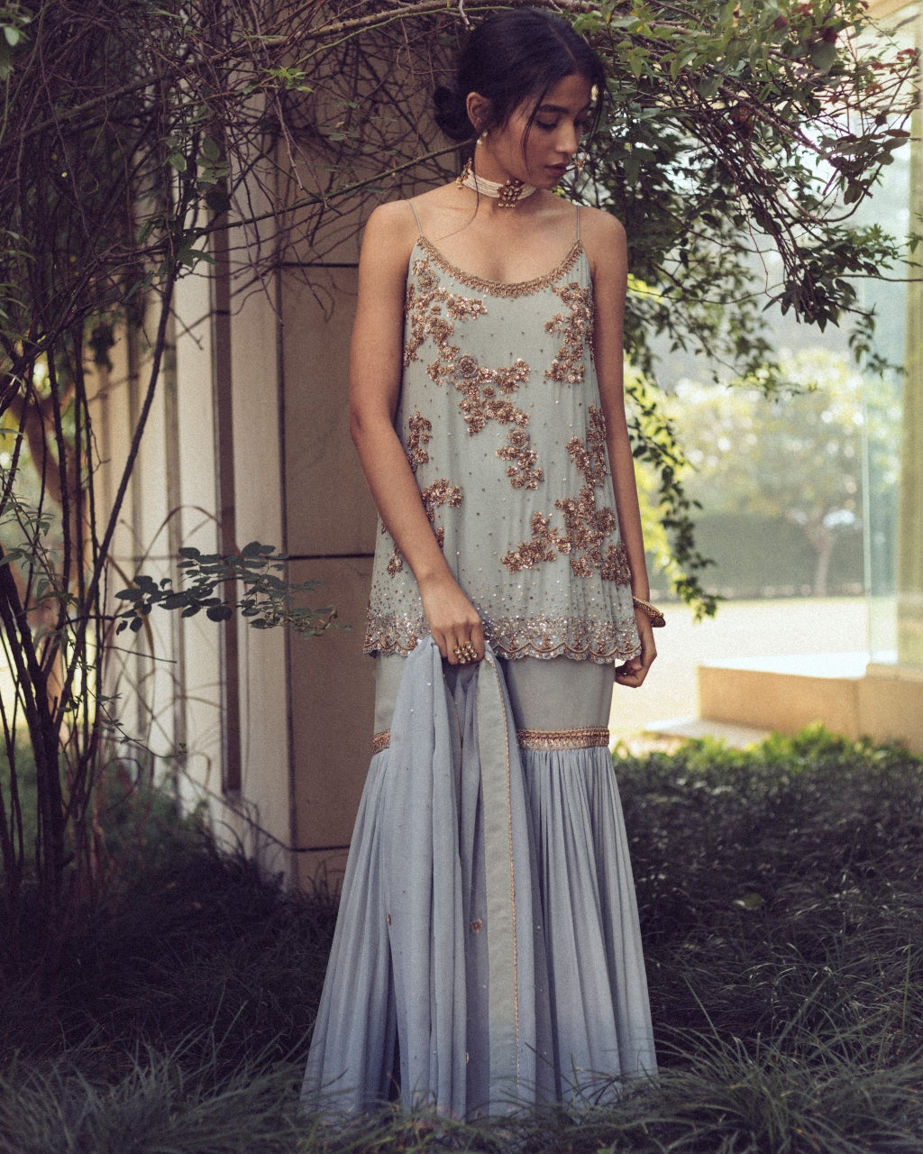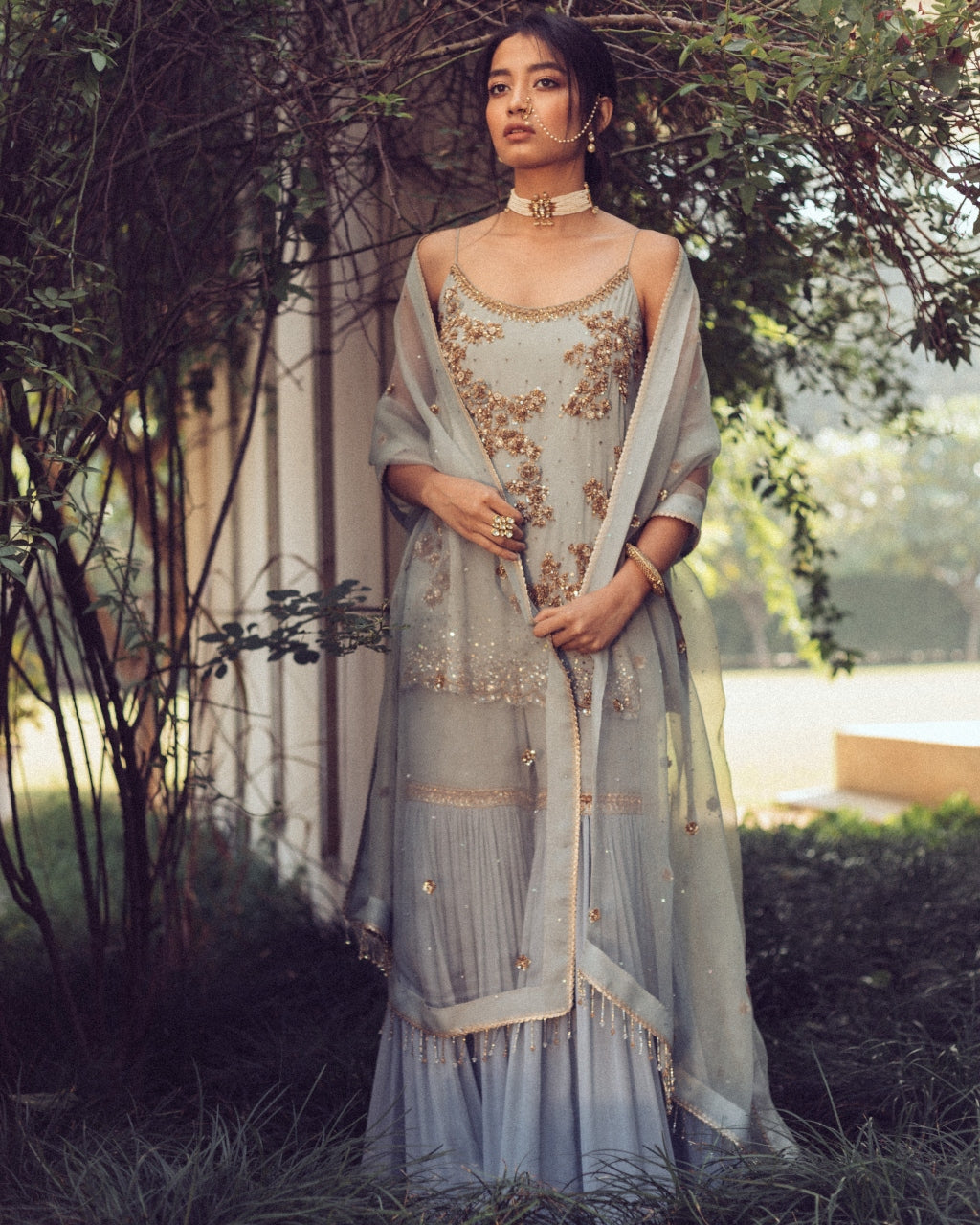 Expertly crafted with intricate dabka and sequin hand embroidery, this Spaghetti gharara set exudes elegance and luxury. The scalloped hem adds a unique touch, while the chiffon gharara and organza dupatta with cutdana tassels complete the look. Perfect for any special occasion.