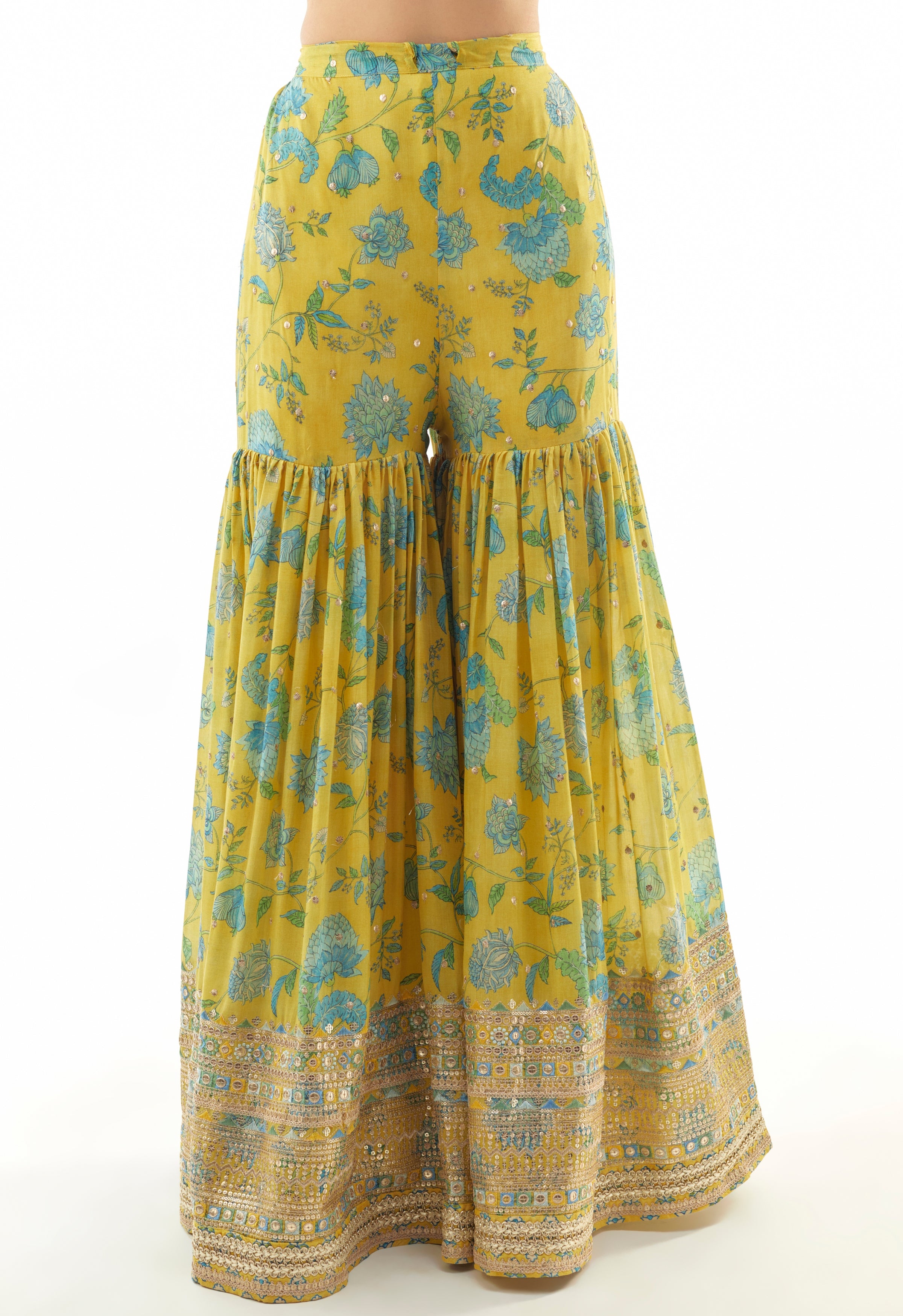 Elevate your festive wardrobe with the Sumedha One Shoulder Sharara Set, featuring delicate floral prints that exude elegance. This sophisticated ensemble is enhanced by intricate gota work, shimmering sequins, and a scalloped border, making it an exquisite choice for mehendi, haldi, or destination celebrations. Its unique one-shoulder design adds a modern touch while maintaining traditional charm.