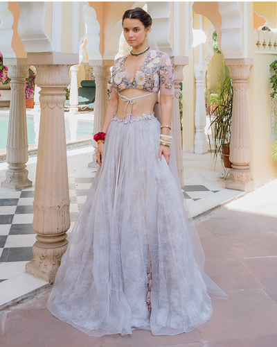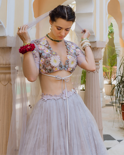 Elevate your bridal ensemble with the Supernova lilac bridal lehenga, a refined blend of elegance and tradition. Crafted in a delicate lilac hue, this lehenga features intricate embroidery and exquisite detailing that capture timeless beauty. Designed to make a graceful statement, it offers a sophisticated silhouette perfect for your special day. Embrace a look that is both regal and contemporary, ensuring you shine with understated charm and poise.