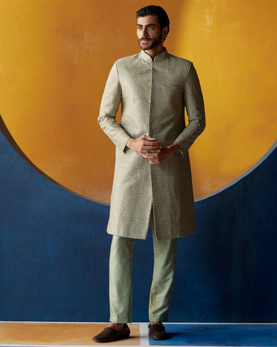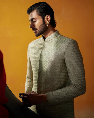 Look your best at any special occasion with this teerth sherwani set. Featuring a luxurious pista green sherwani with exquisite kasab texture all over, it is paired with ahimsa silk straight pants in the same hue. Make a lasting impression with this luxurious sherwani set.