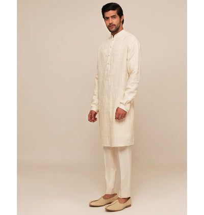 Indulge in pure elegance with our text kurta set. The intricate textual thread work pattern adds a touch of luxury to this ensemble, while the stylish vanilla breeches provide comfort and sophistication. Elevate your wardrobe with this exclusive set.