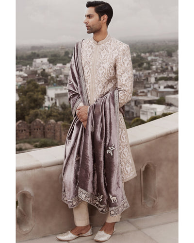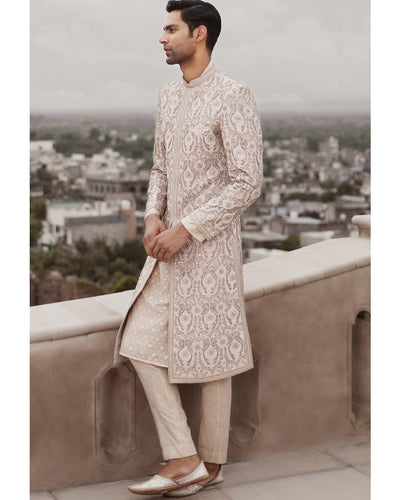 Upgrade your groom game with the royal amanbagh sherwani set. Crafted from luxurious raw silk in a modern beige hue, this sherwani features intricate anmol gold dori work and hand embroidery with sequins, mirrors, and zardozi. Layered over a pure banarasi booti kurta set, it exudes a sophisticated and regal vibe.