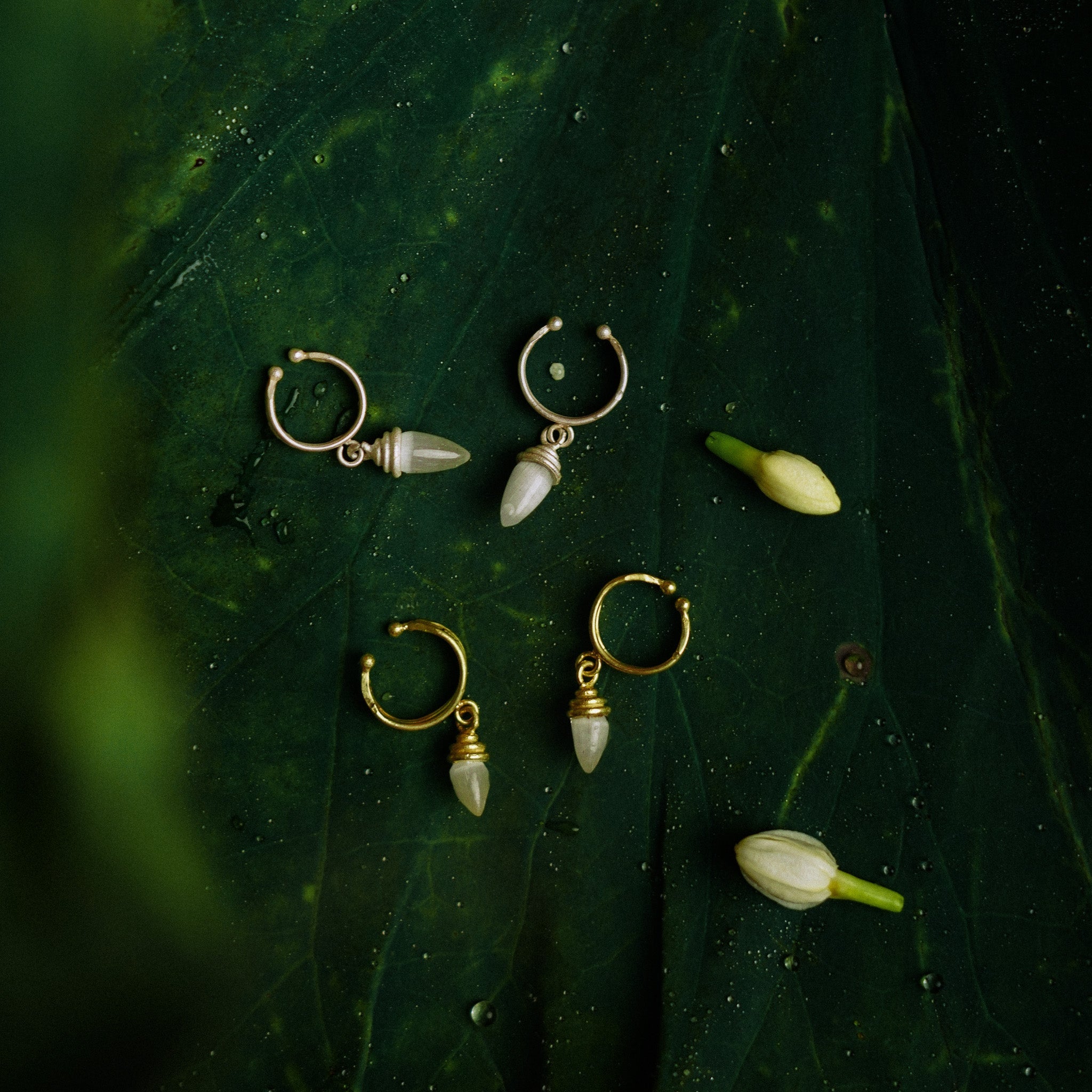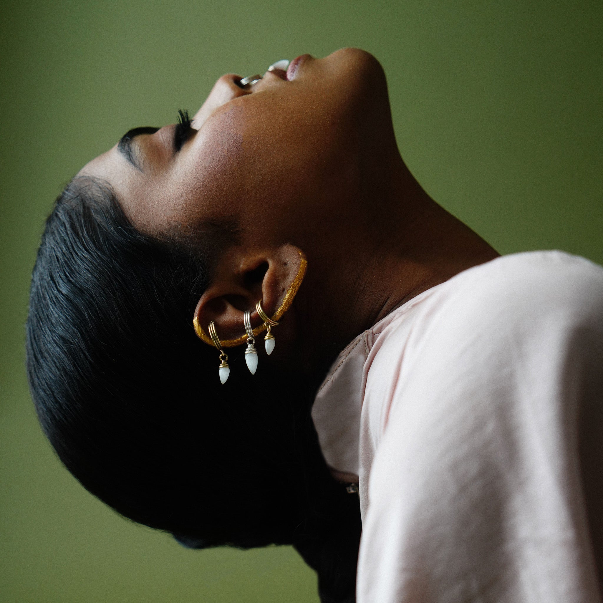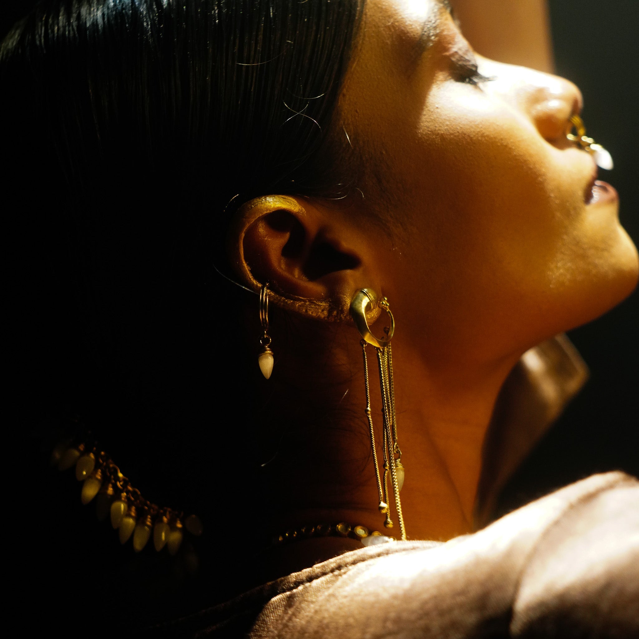 A minutely designed ear cuff with three ridges running across its length, and a hand-carved Mogra dangling off it, the emotion of Wonder and the playfulness it inspires is captured through this piece. Designed to be stacked and mixed with other pieces, this ear cuff allows you to express your personal style and can even be worn as a septum ring, or a hair accessory.
