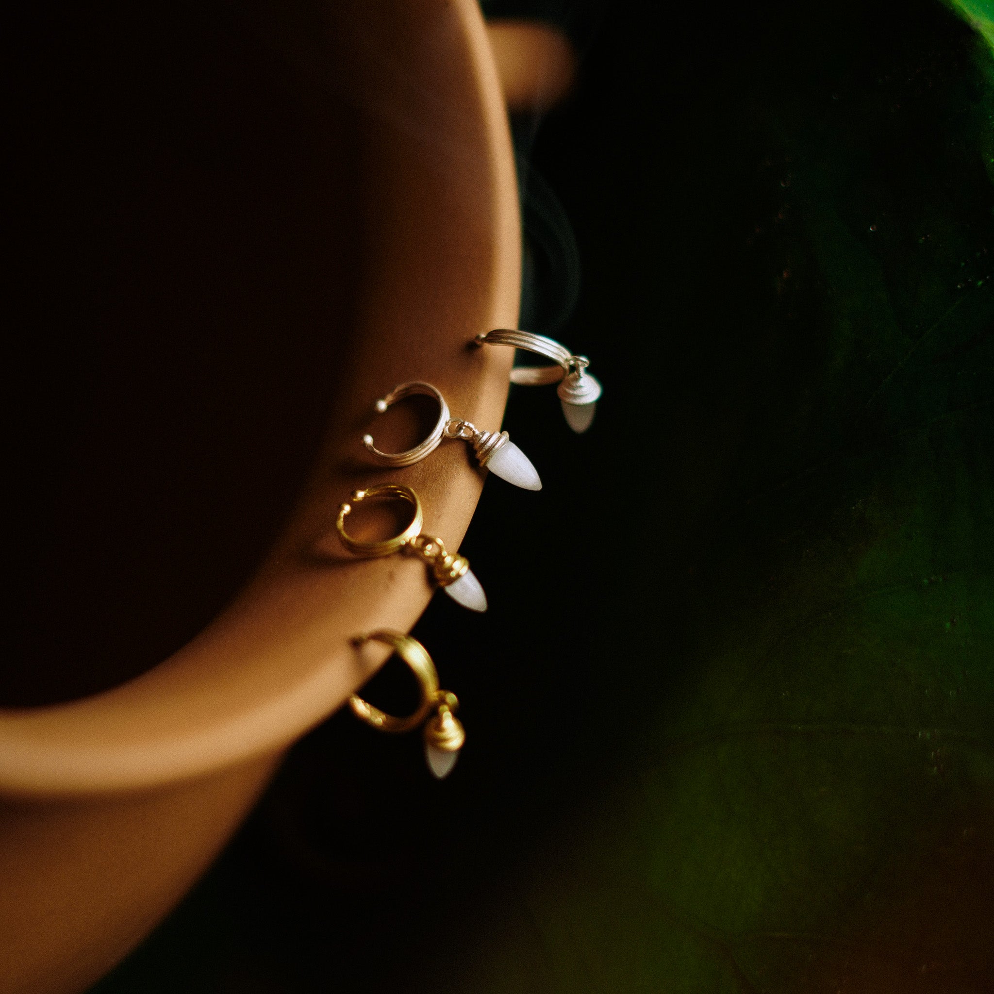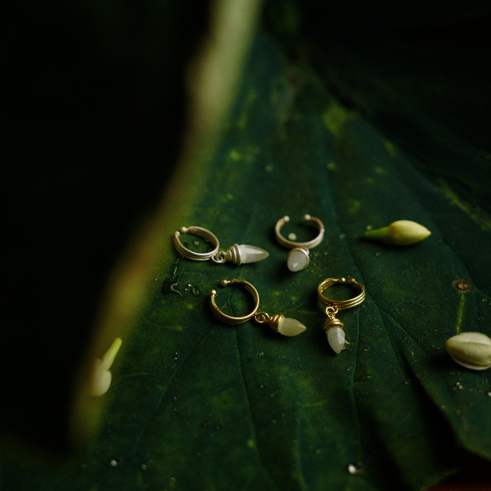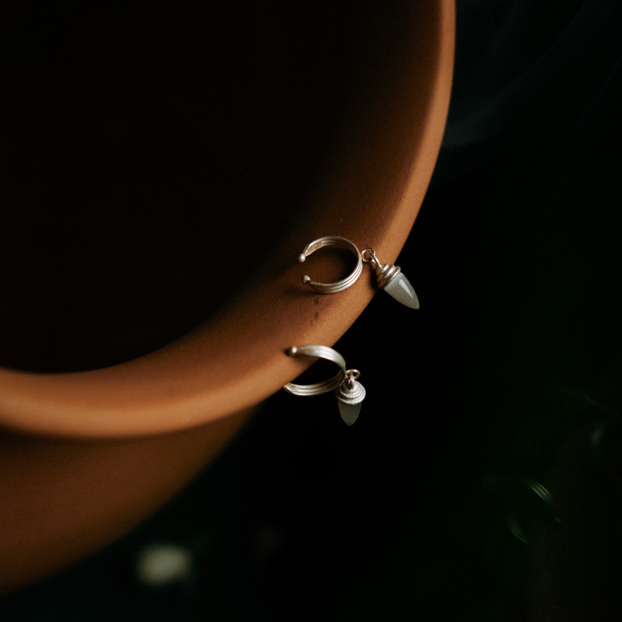 A minutely designed ear cuff with three ridges running across its length, and a hand-carved Mogra dangling off it, the emotion of Wonder and the playfulness it inspires is captured through this piece. Designed to be stacked and mixed with other pieces, this ear cuff allows you to express your personal style and can even be worn as a septum ring, or a hair accessory.