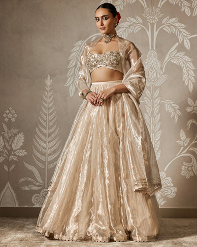 Experience sophistication and luxury with the Zarish lehenga set. This exquisite set features a tissue placement embroidered blouse and a plain tissue lehenga, paired with a delicately embroidered border tissue dupatta. Elevate your style game and make a statement at any event with this exclusive piece.