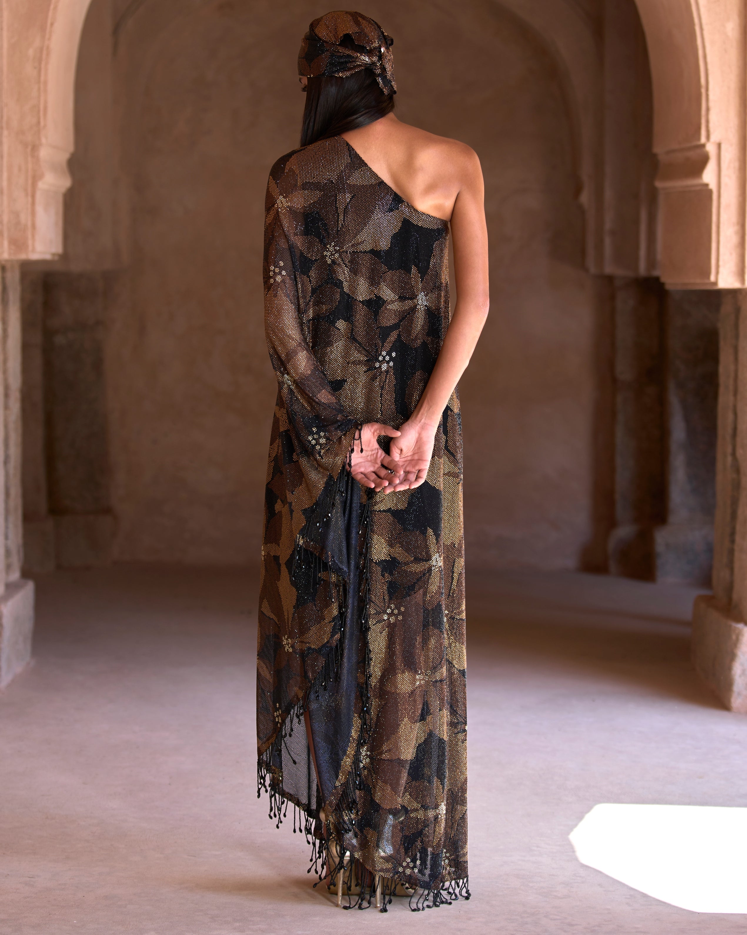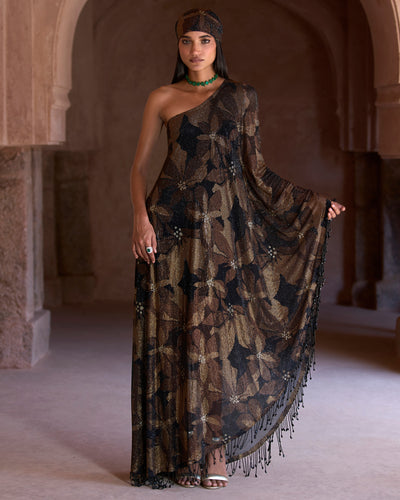 This Zeina kaftan dress is the epitome of elegance and glamour. Its one-shoulder design and black and gold floral pattern exude sophistication, while the crystal droplet embellishment adds a touch of luxury. The full-length cut and matching headgear complete the look, making it the perfect outfit for any special occasion. Step into the spotlight with this beautiful kaftan dress.