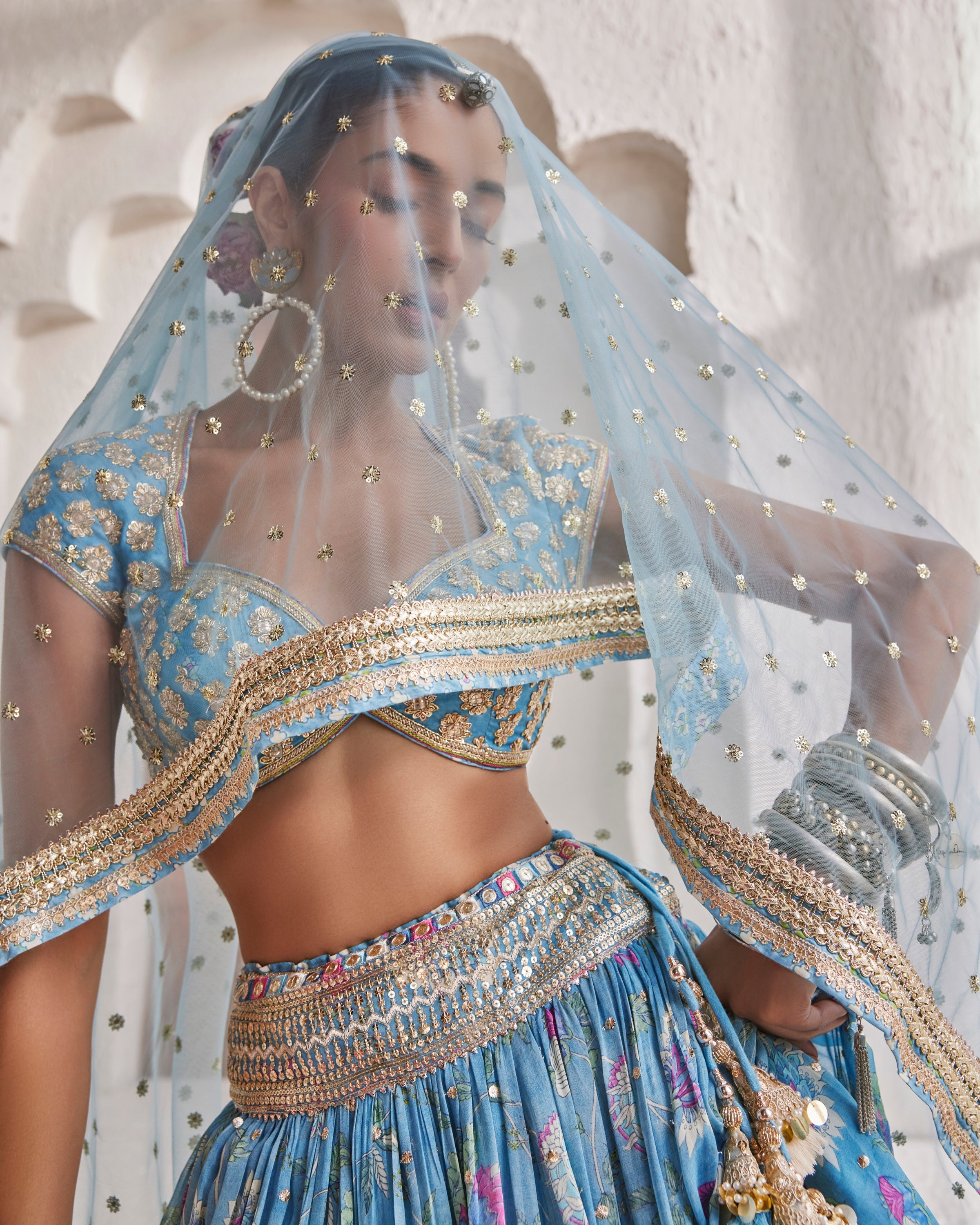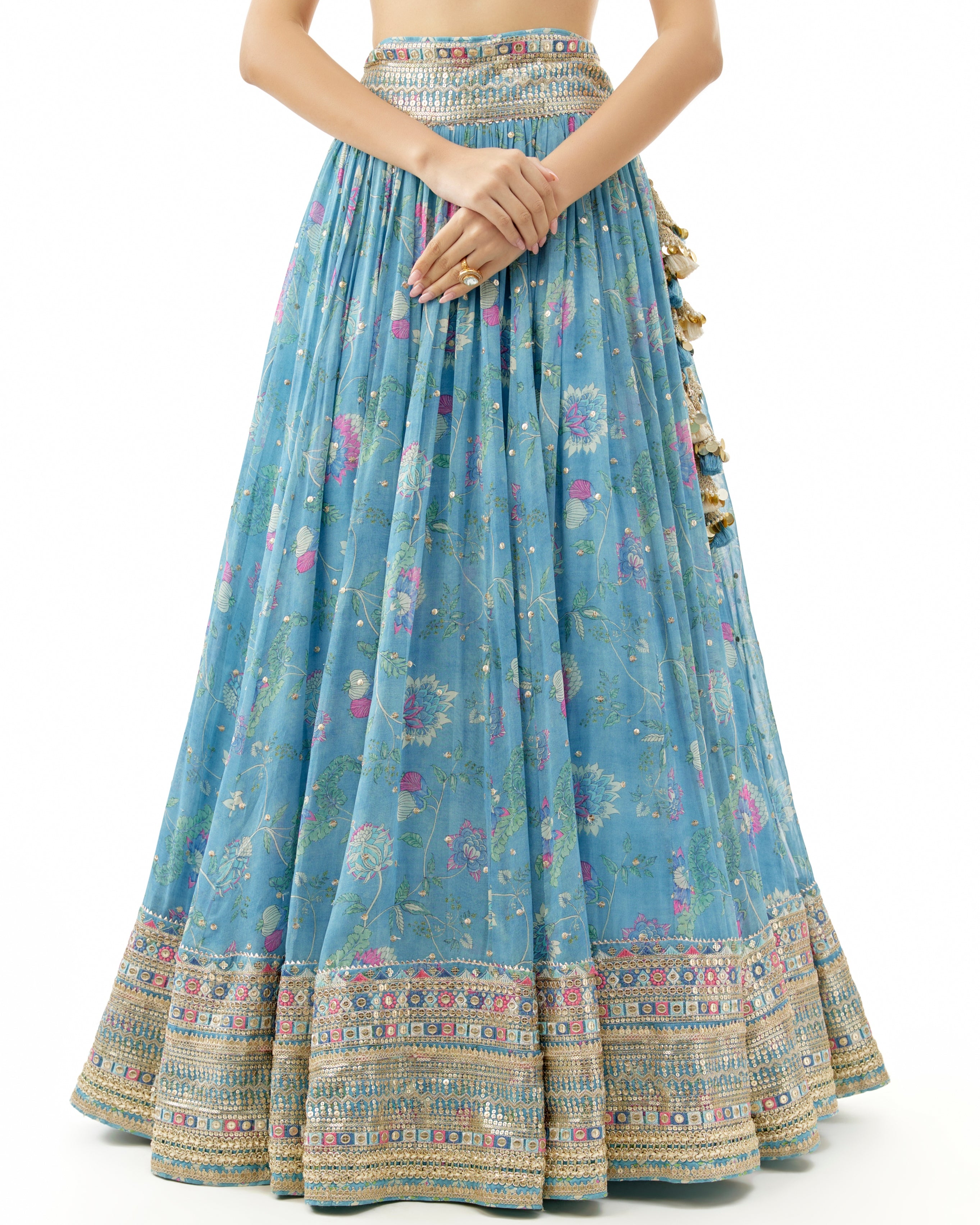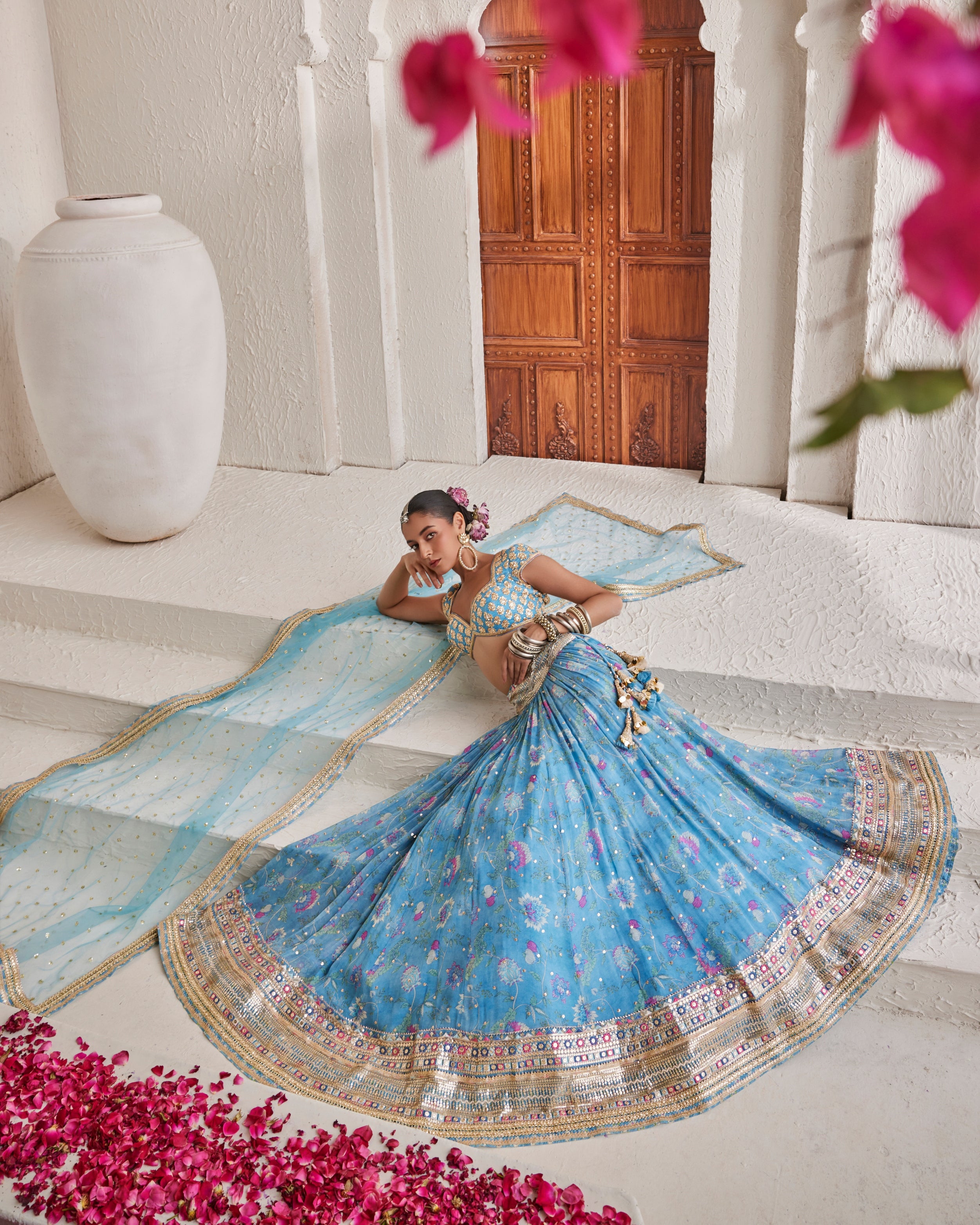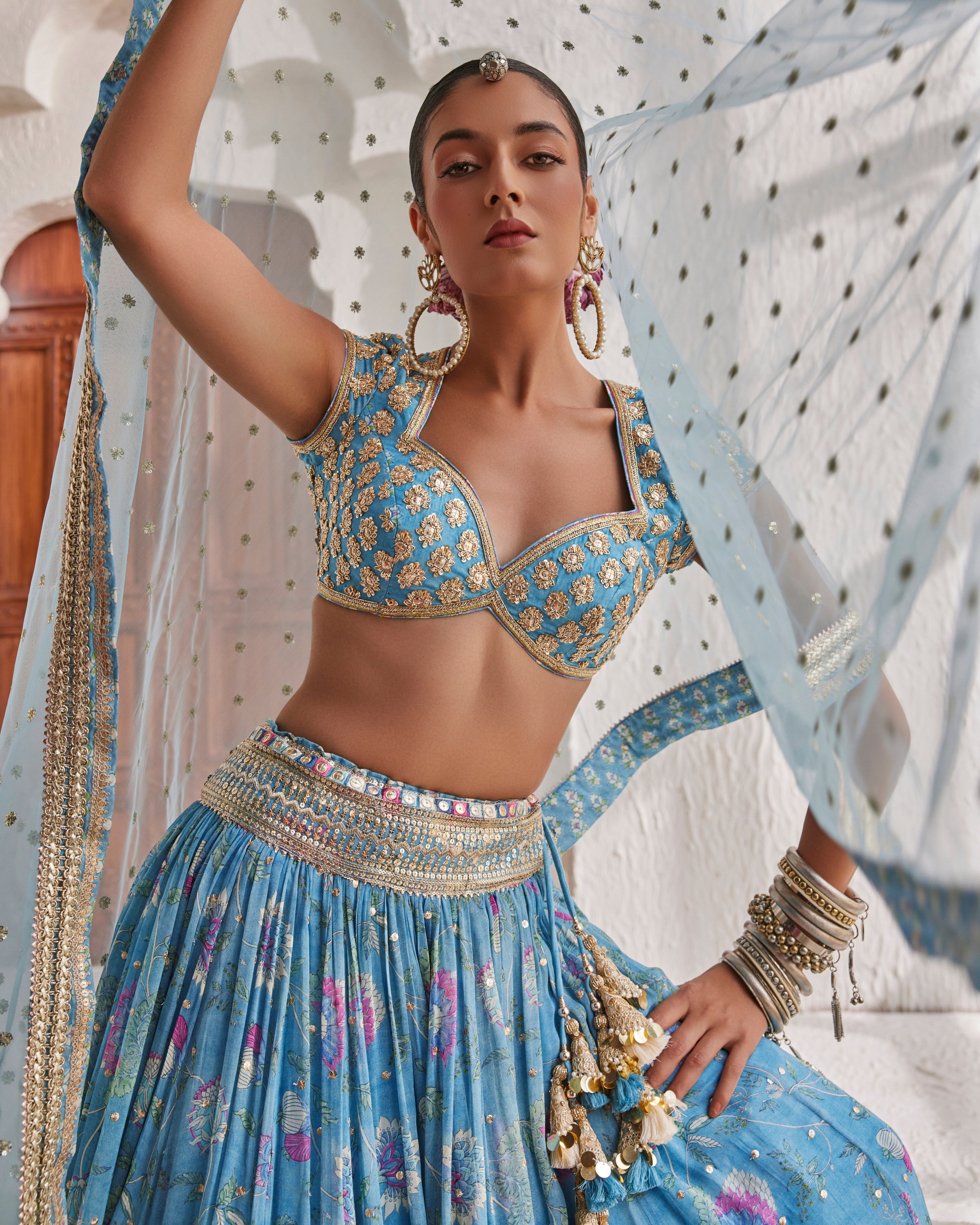 This Zil lehenga set showcases a deep v-neck hand blouse, exquisitely embroidered to create a striking yet refined silhouette. Playful tassels at the hem add a touch of charm. The flared lehenga skirt captivates with intricate floral motifs and detailed work along the hem, enhancing its elegant appeal. A matching dupatta, subtly dotted with sequins and bordered to complement the embroidery, completes this sophisticated ensemble. Perfect for making a graceful statement at any special occasion.