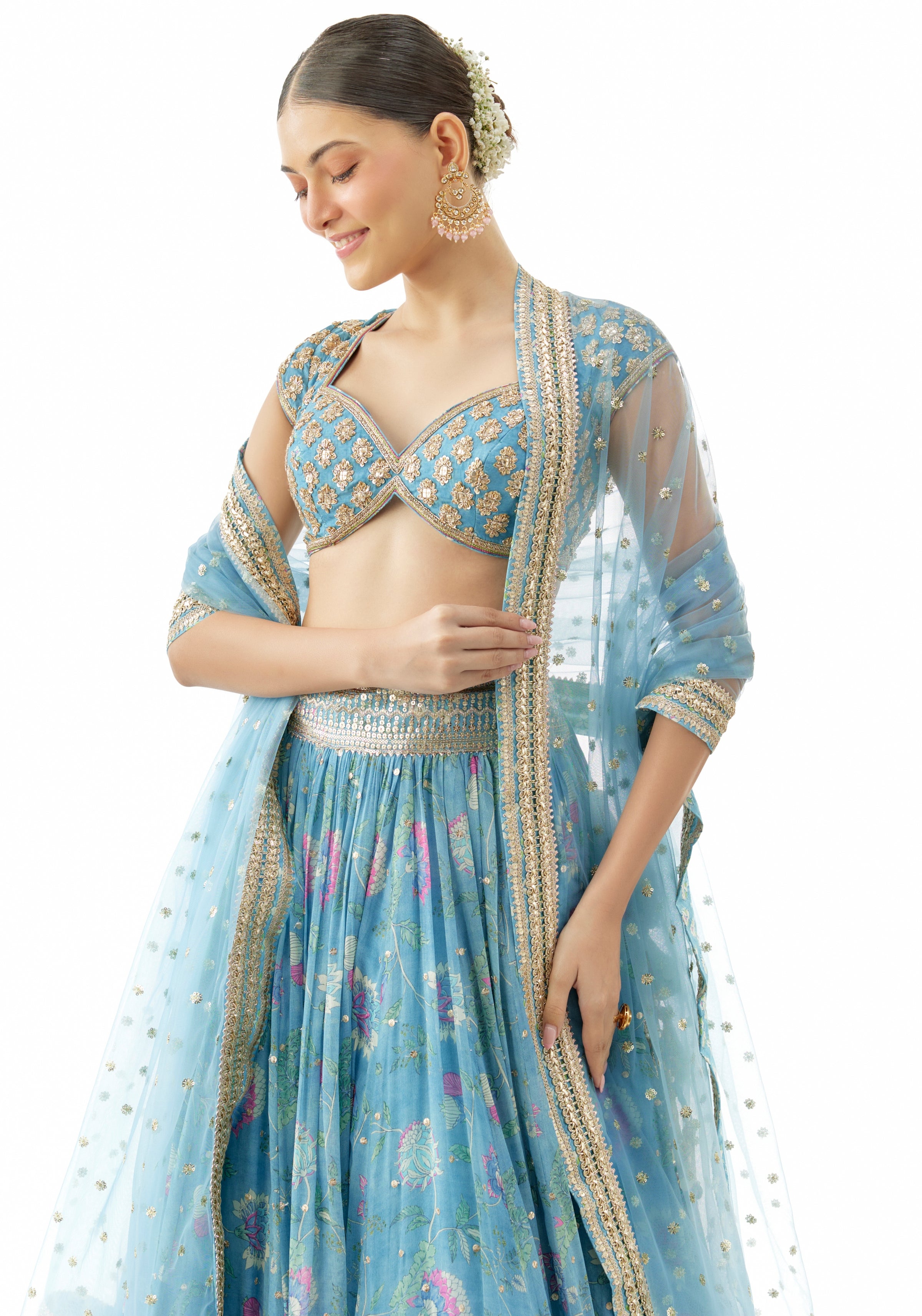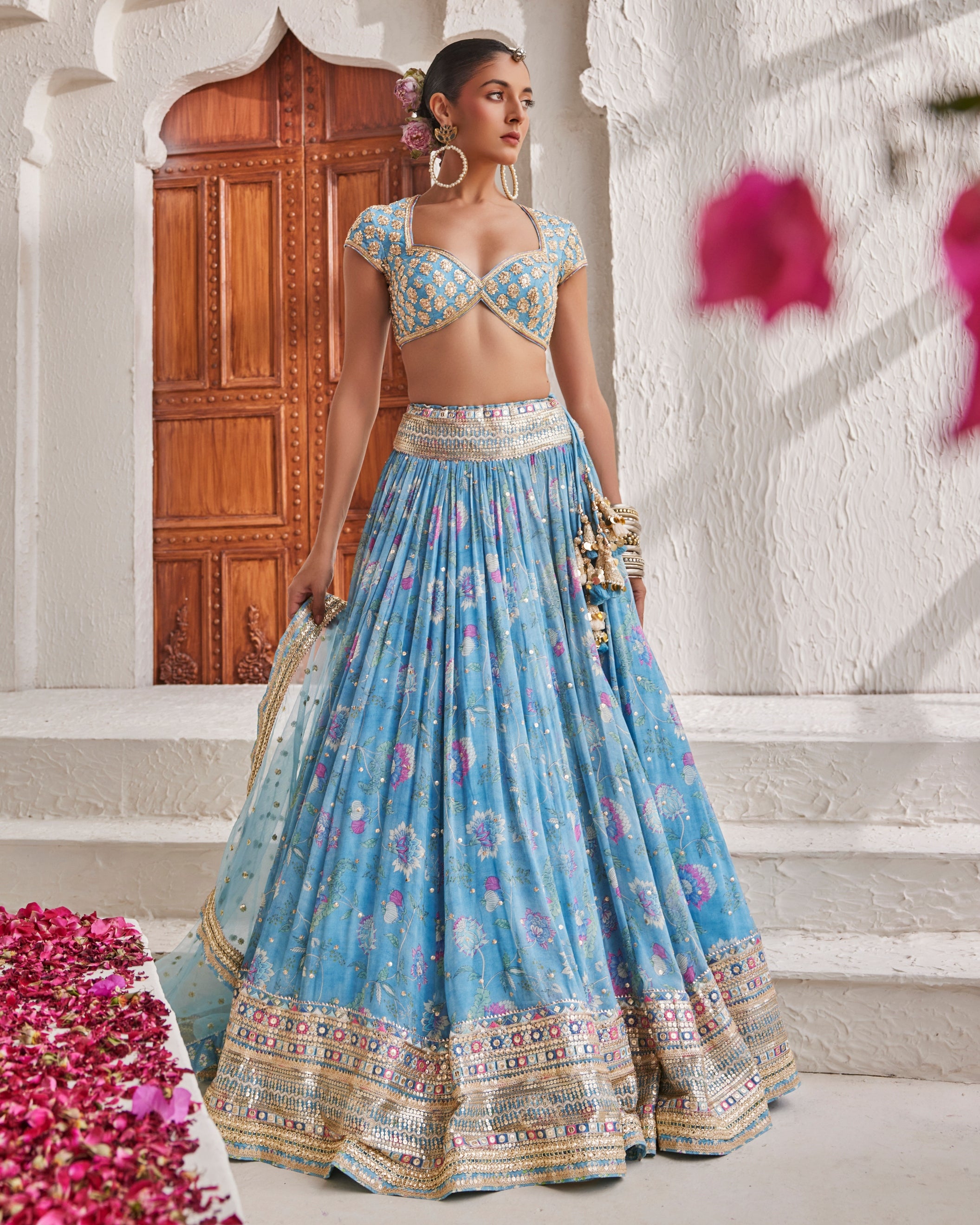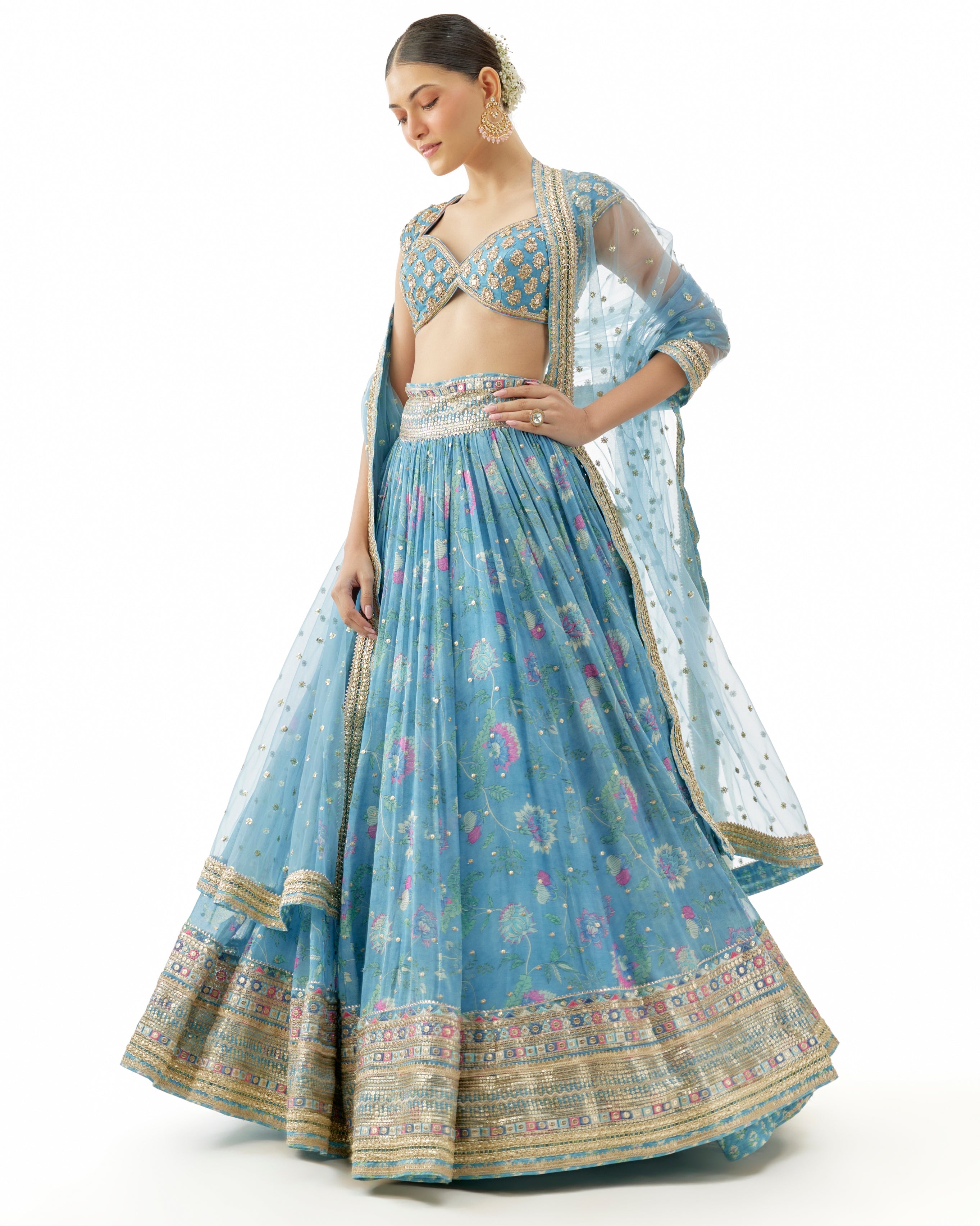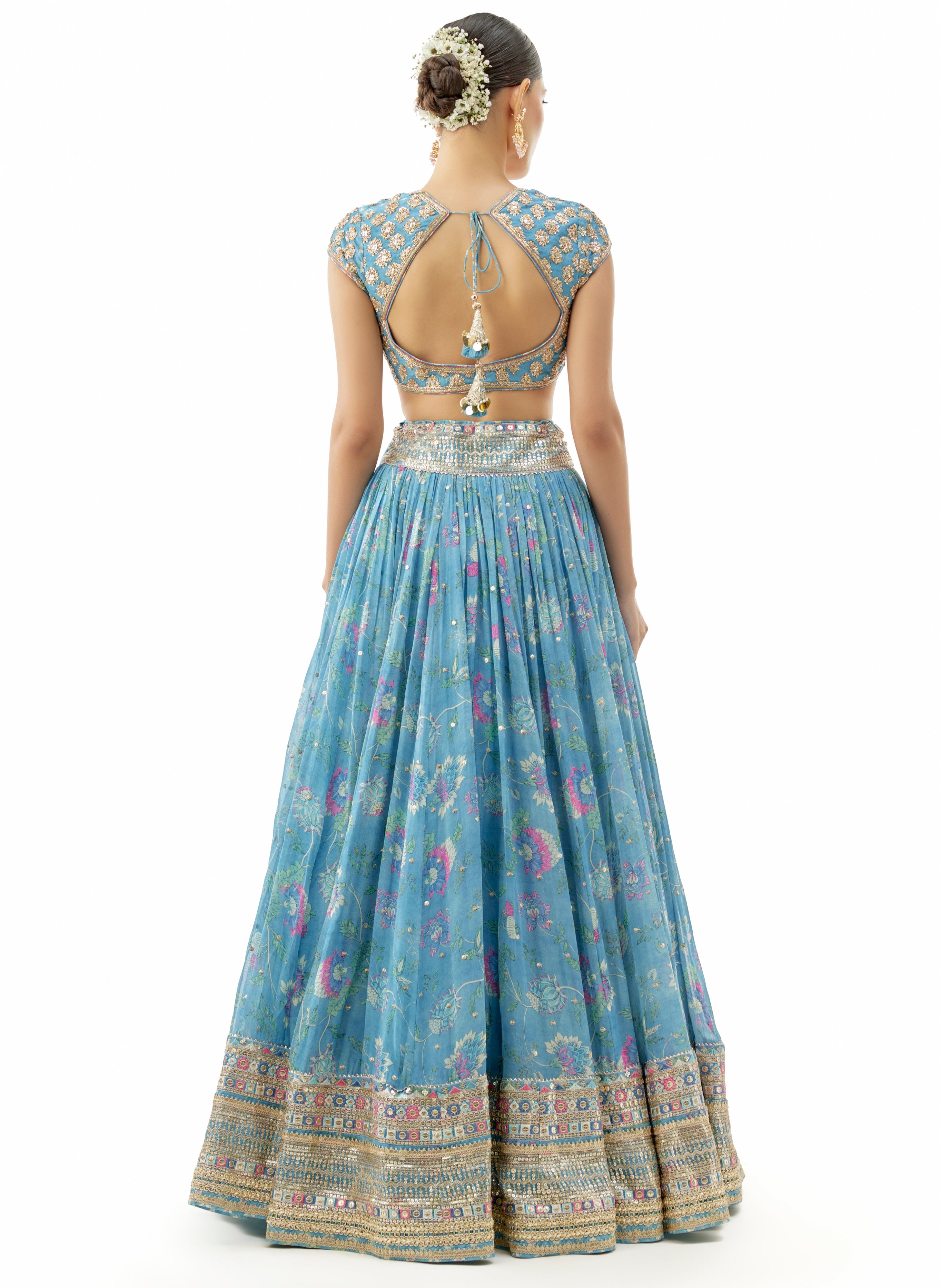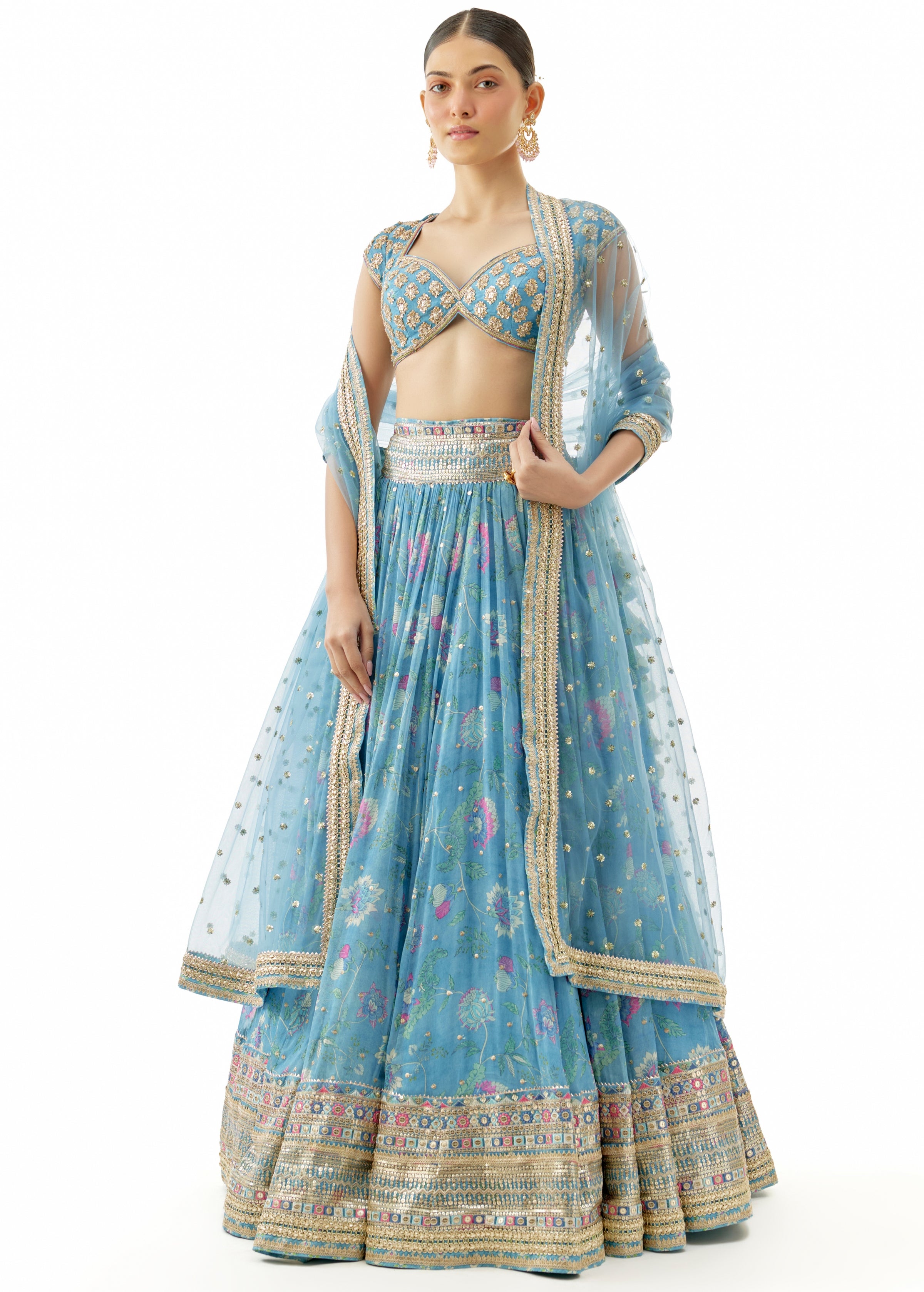 This Zil lehenga set showcases a deep v-neck hand blouse, exquisitely embroidered to create a striking yet refined silhouette. Playful tassels at the hem add a touch of charm. The flared lehenga skirt captivates with intricate floral motifs and detailed work along the hem, enhancing its elegant appeal. A matching dupatta, subtly dotted with sequins and bordered to complement the embroidery, completes this sophisticated ensemble. Perfect for making a graceful statement at any special occasion.